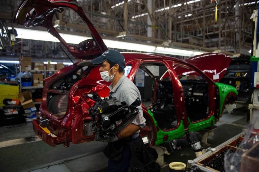 A worker carries parts of a car at Mazda's plant in Salamanca, Guanajuato state, Mexico, on November 9, 2022. - As applause rang out at a nearby international arts festival, Bibiana Mendoza unearthed human remains from a clandestine grave in a Mexican region where prosperity, culture and cartel violence meet. (Photo by CLAUDIO CRUZ / AFP) (Photo by CLAUDIO CRUZ/AFP via Getty Images)