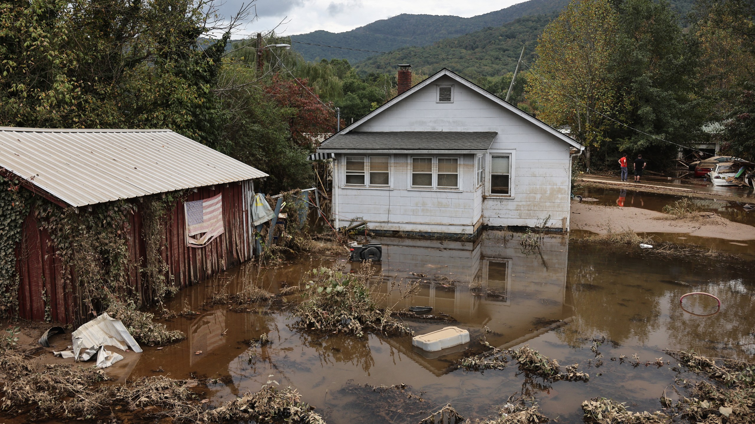 An American flag hangs above floodwaters remaining from Hurricane Helene on October 4, 2024 in Swannanoa, North Carolina. (Photo by Mario Tama/Getty Images)