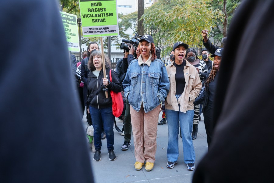 NEW YORK, NEW YORK – OCTOBER 21: Protesters gather outside of a New York City courthouse as jury selection begins in the trial of Daniel Penny, who is charged in the death of Jordan Neely, on October 21, 2024, in New York City. Penny, 26, a former Marine, is charged in the death of Jordan Neely on a New York City subway by choking him after an altercation involving panhandling on the train car. (Photo by Spencer Platt/Getty Images)