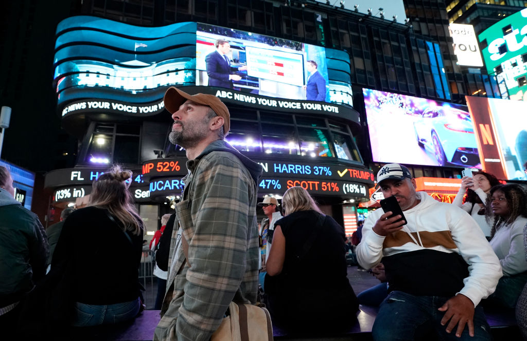 People watch election results at Times Square in New York on November 5, 2024. (Photo by TIMOTHY A. CLARY / AFP) (Photo by TIMOTHY A. CLARY/AFP via Getty Images)
