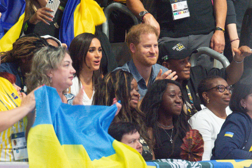 The Duchess of Sussex Meghan Markle and the Duke of Sussex Prince Harry are seen attending the volleyball match between Nigeria and Ukraine at the stadium during the wheelchair basketball game between Australia and Ukraine at the Merkur Spiel Arena in Dusseldorf, Germany on September 14th, 2023 (Photo by Ying Tang/NurPhoto via Getty Images).