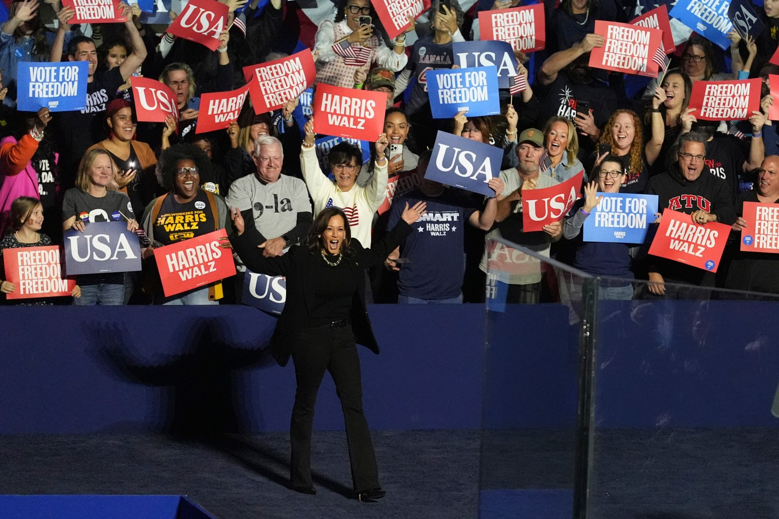 Pro-Palestinian protesters began chanting in the back, but the crowd drowned them out. Harris concluded her remarks at 9:13 p.m., as Katy Perry began performing “Dark Horse.”