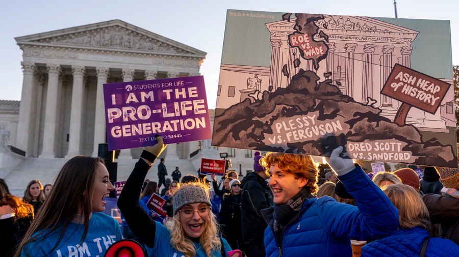 Anti-abortion protesters wear shirts that read "I am the Pro-Life Generation" as they demonstrate in front of the U.S. Supreme Court, Wednesday, Dec. 1, 2021, in Washington, as the court hears arguments in a case from Mississippi, where a 2018 law would ban abortions after 15 weeks of pregnancy, well before viability. (AP Photo/Andrew Harnik)