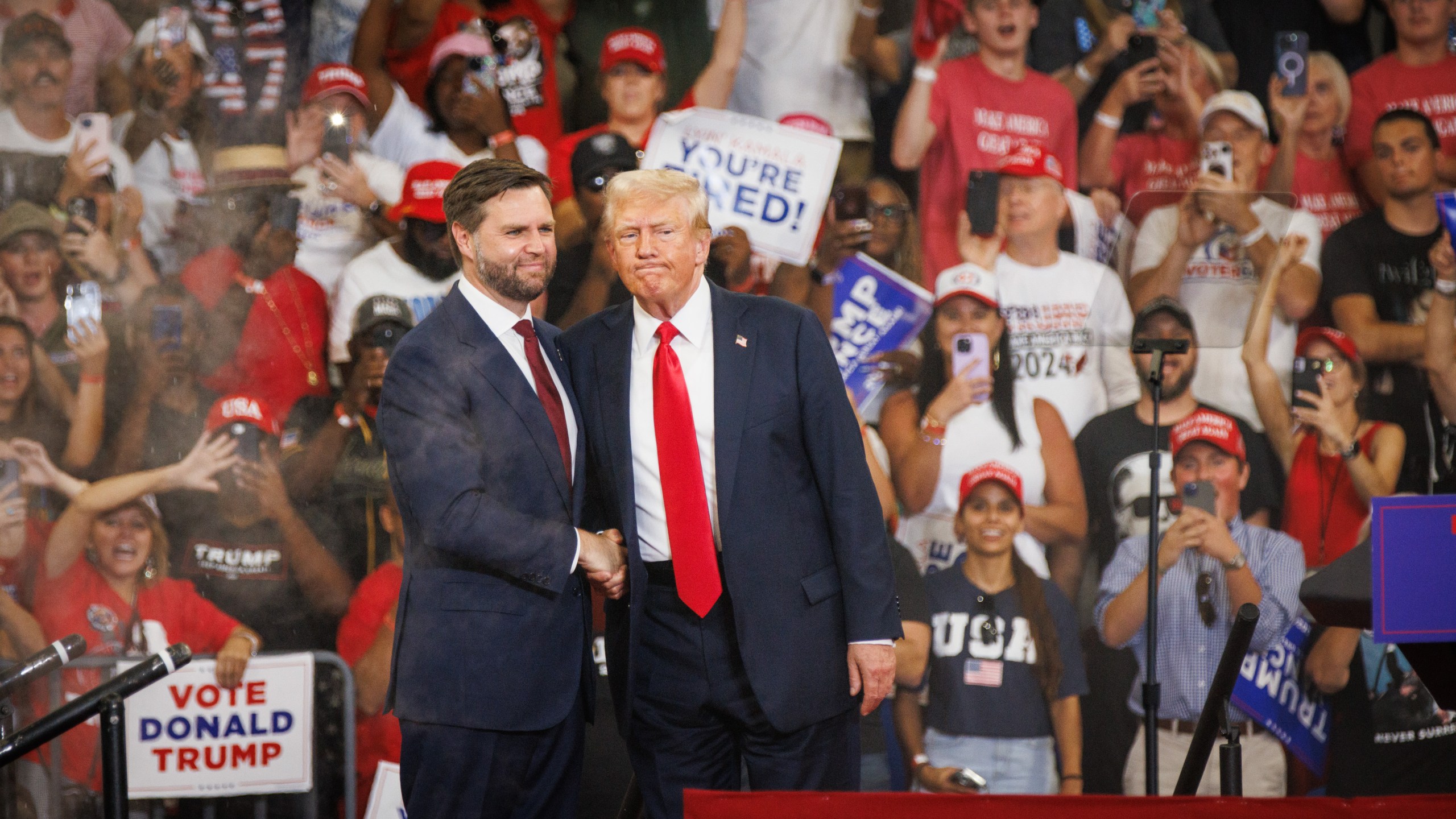 Former US President Donald Trump shakes hands with Senator JD Vance, a Republican from Ohio and Republican vice-presidential nominee, during a campaign event in Atlanta, Georgia, US, on Saturday, Aug. 3, 2024. Trump said he is willing to debate Vice President Kamala Harris on Fox News on Sept. 4 in Pennsylvania, although it wasn’t clear if the Democratic nominee had been consulted on the terms of the proposal. Photographer: Dustin Chambers/Bloomberg via Getty Images