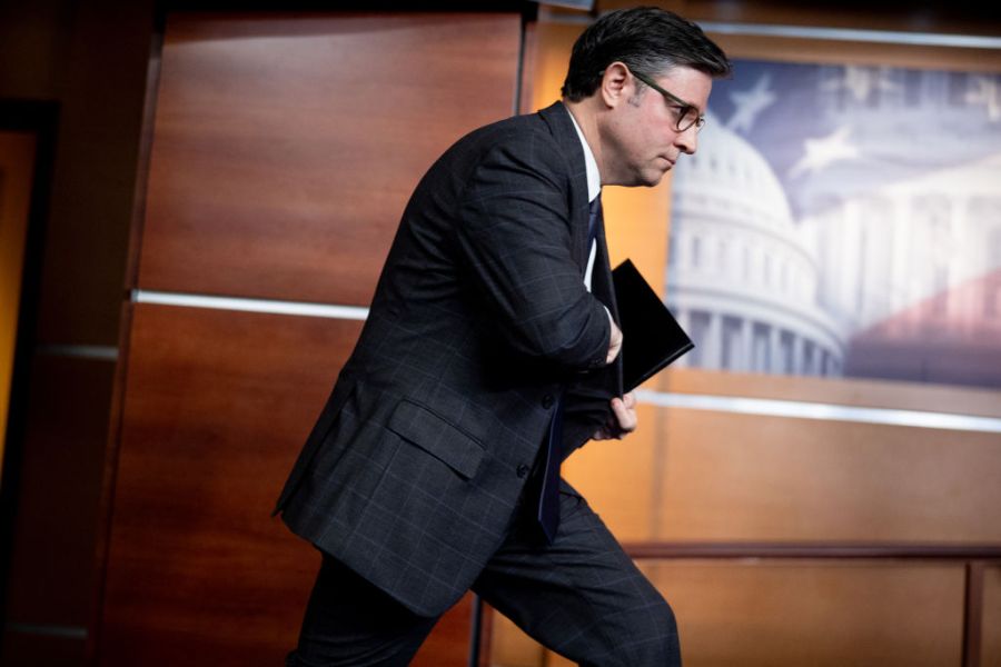 WASHINGTON, DC - NOVEMBER 19: U.S. Speaker of the House Mike Johnson arrives for a news conference on Capitol Hill on November 19, 2024 in Washington, DC. Johnson discussed his reaction to a resolution by Rep. Nancy Mace (R-SC) to ban transgender women from using female bathrooms as Rep.-elect Sarah McBride (D-DE) is set to join the House as the first openly transgender member of Congress, U.S. President-elect Donald Trump's legislative agenda and cabinet picks, and other topics following a House Republican Caucus meeting. (Photo by Andrew Harnik/Getty Images)