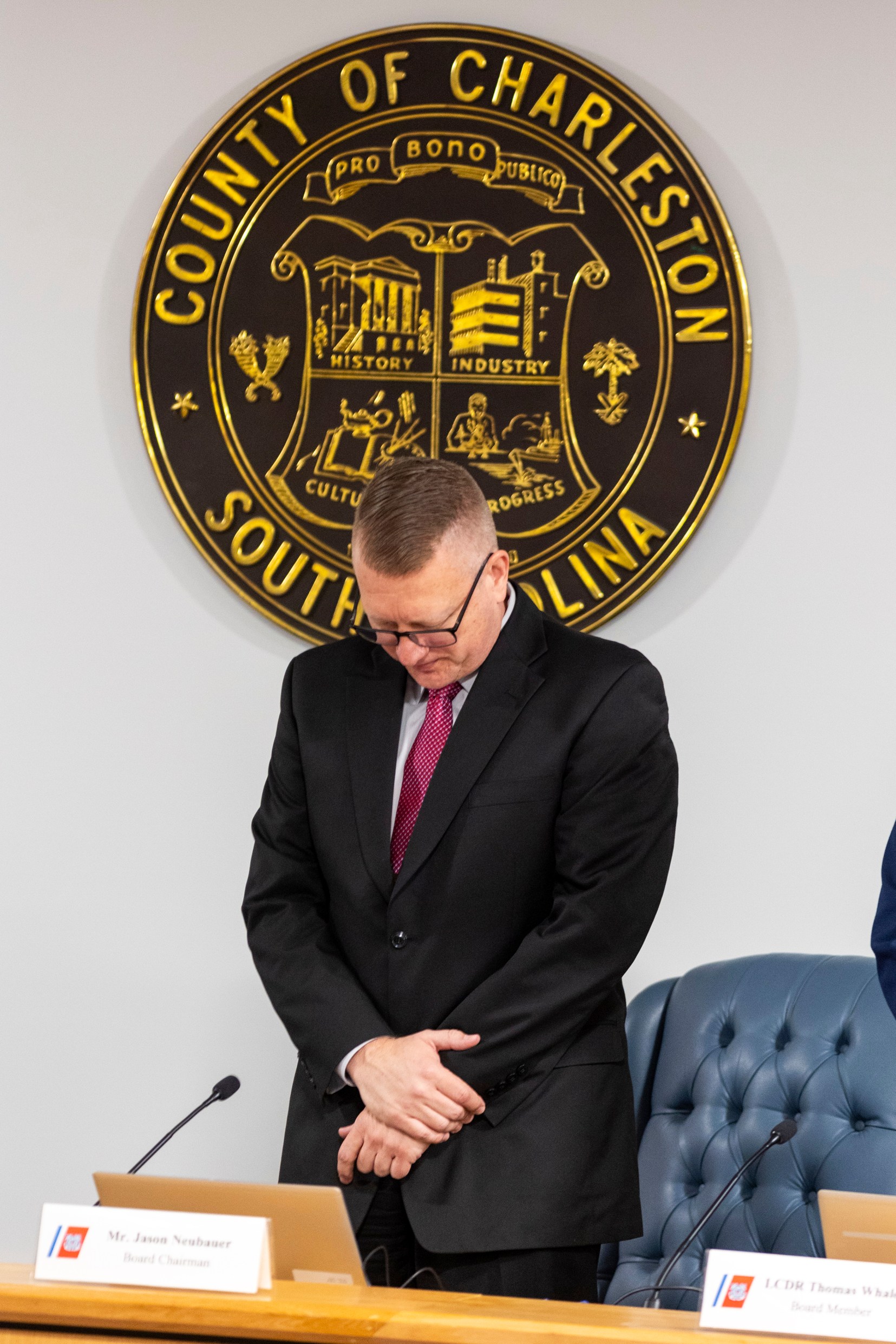 Jason Neubauer, board chairman, of the investigative board for the Titan marine board formal hearing pauses for a moment of silence inside the Charleston County Council Chambers Monday, Sept. 16, 2024, in North Charleston, S.C. (AP Photo/Mic Smith)