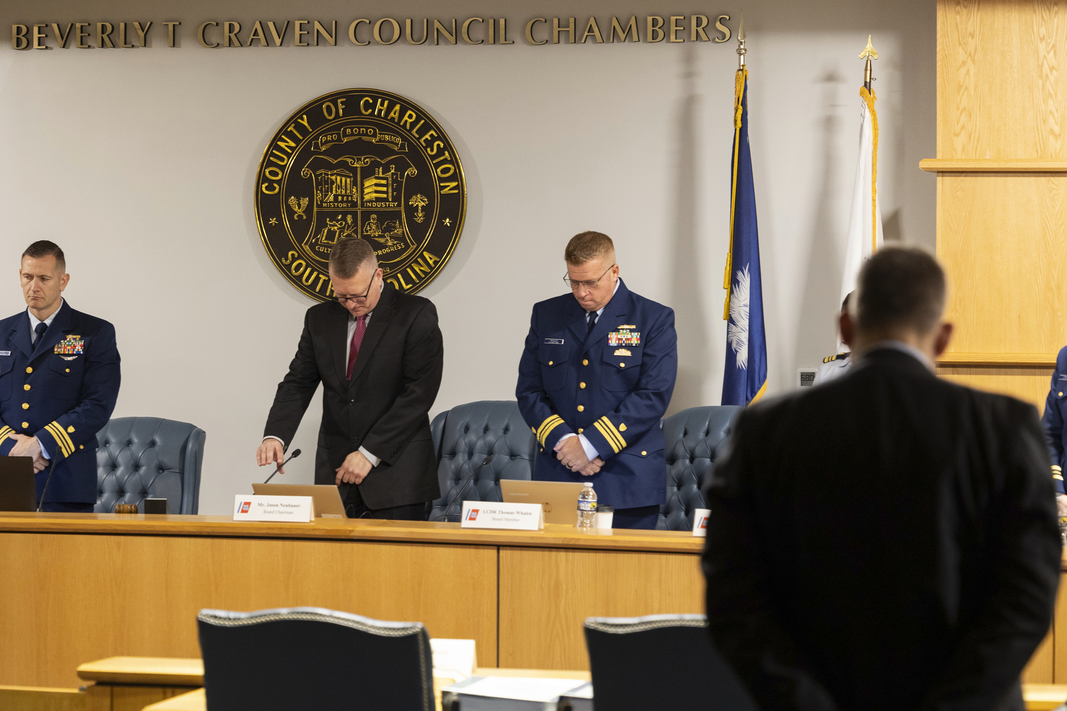 Coast Guard members of the investigative board for the Titan marine board formal hearing pause for a moment of silence inside the Charleston County Council Chambers Monday, Sept. 16, 2024, in North Charleston, S.C. (AP Photo/Mic Smith)