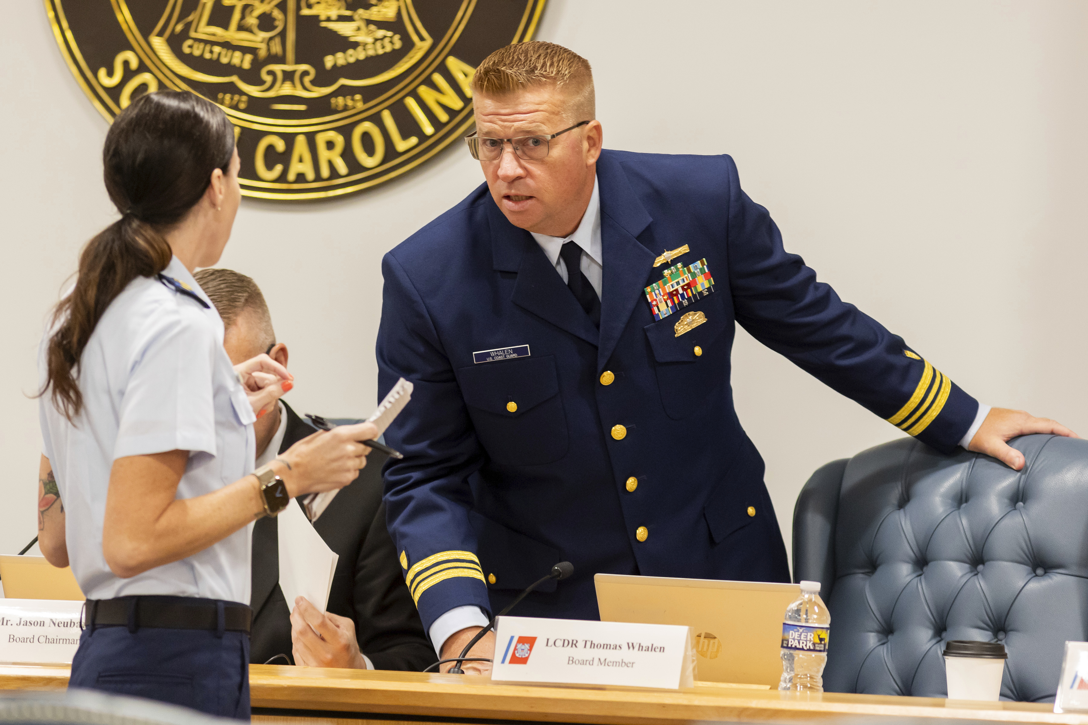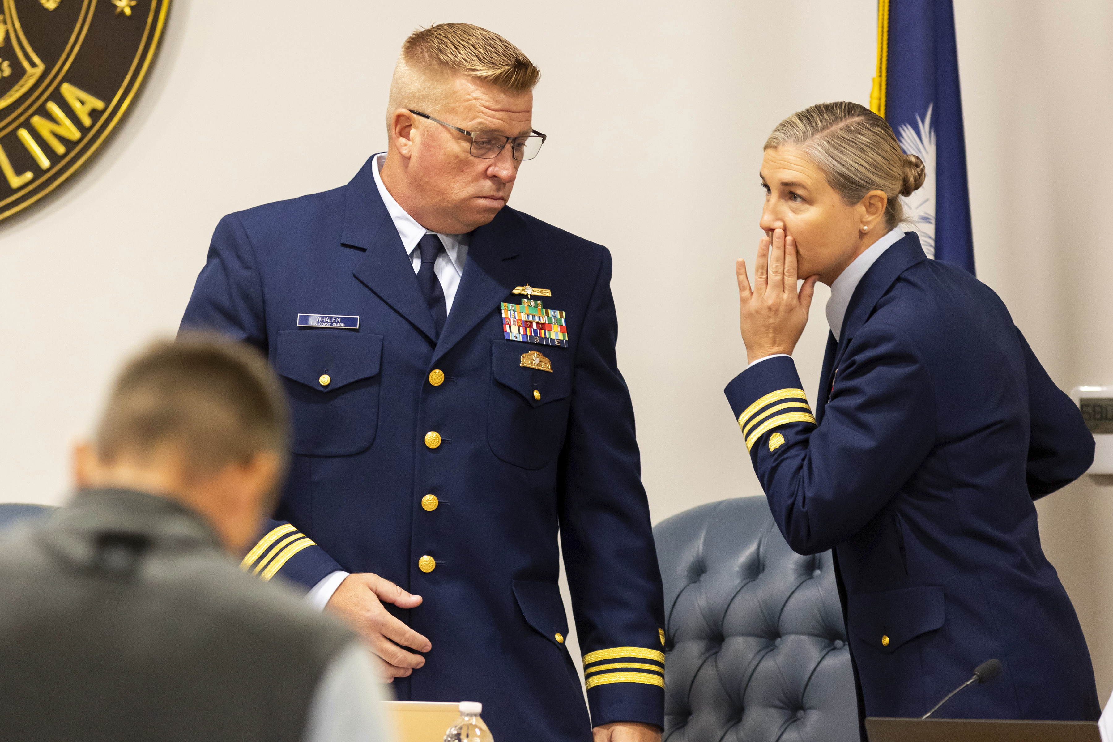 Coast Guard’s Thomas Whalen speaks with another Coast Guard member during a break for the Titan marine board formal hearing inside the Charleston County Council Chambers, Monday, Sept. 16, 2024, in North Charleston, S.C. (AP Photo/Mic Smith)