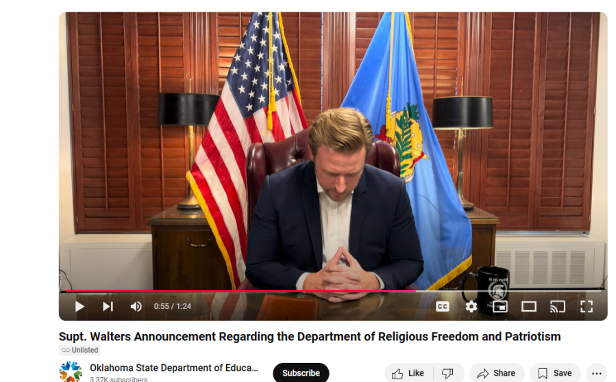 The video, titled ‘Supt. Walters Announcement Regarding the Department of Religious Freedom and Patriotism,” begins with Walters facing a camera while sitting at the desk in his office.