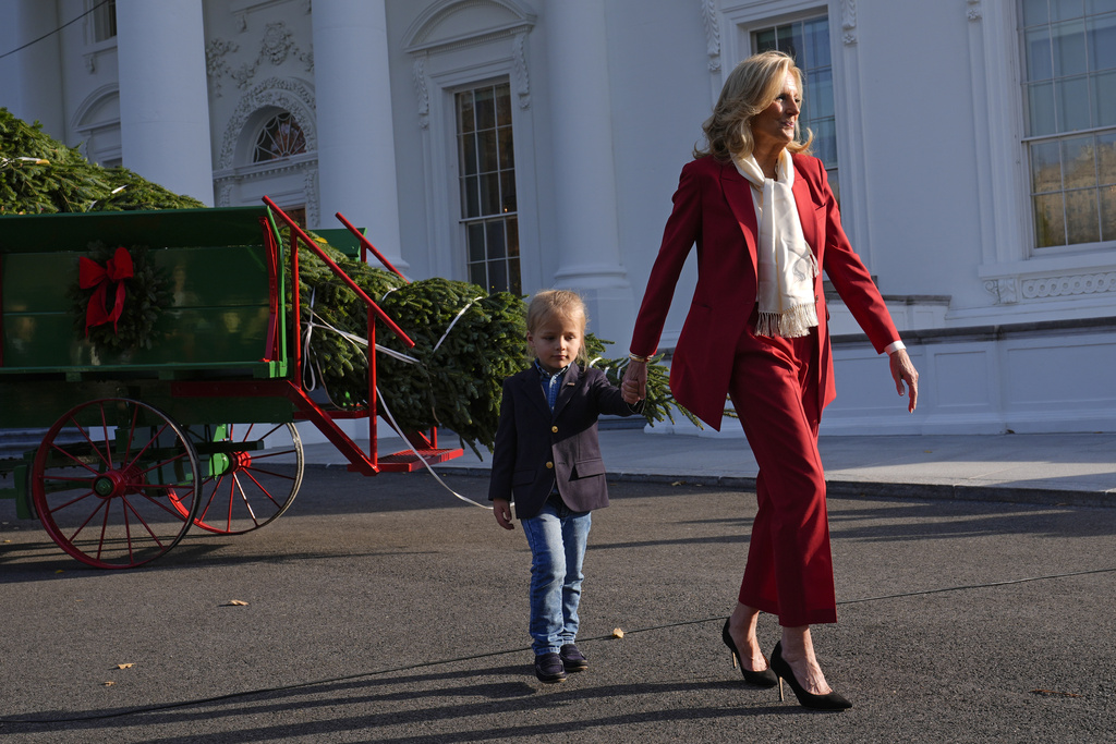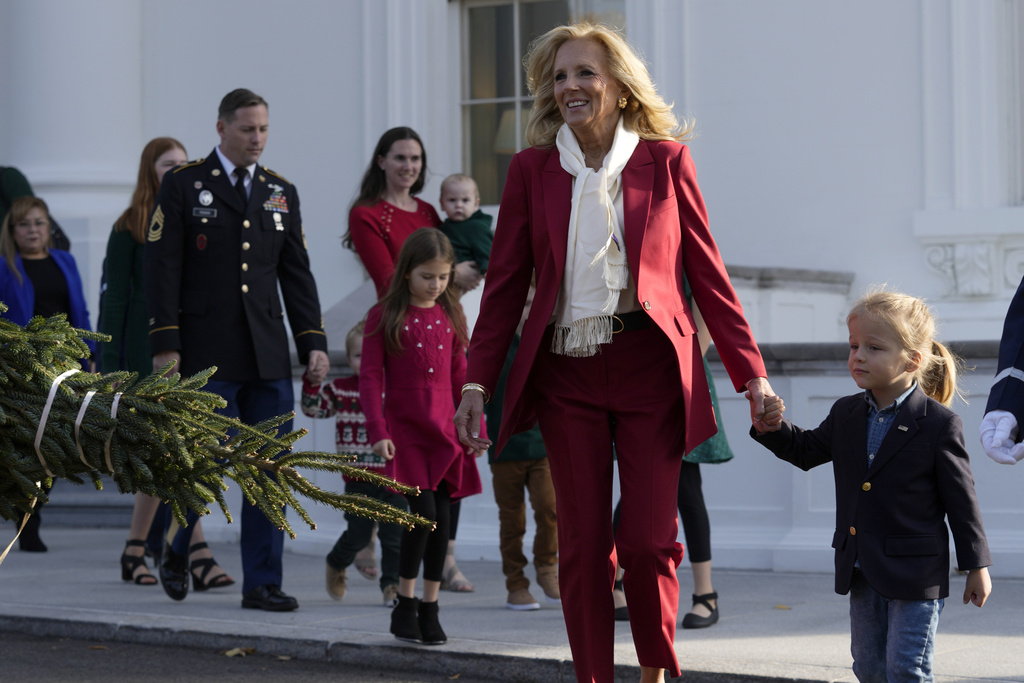 “In just a few days, volunteers from all over the country will pour in to transform this tree and the entire White House,” Biden said during her brief remarks. “And out of the whirlwind of glitter and garlands will come the warmth and comfort of the season.”