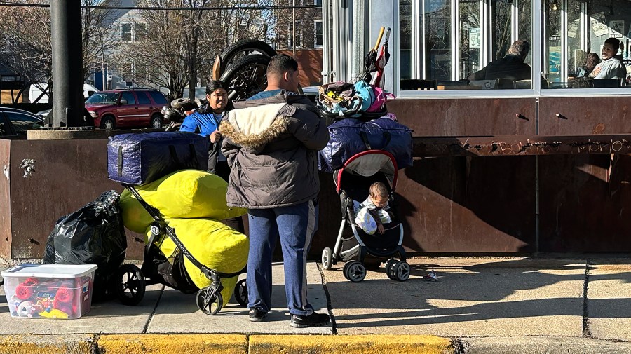 Migrants collect their belongings and stand on the street in Chicago March 27, 2024.