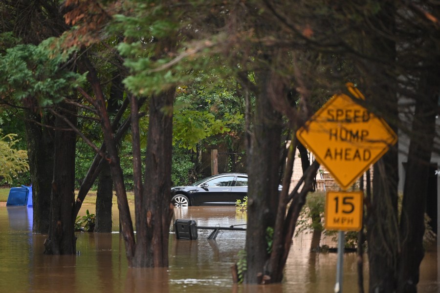 A car in a flooded street is seen after Hurricane Helene made landfall in Atlanta, Georgia, on September 27, 2024. Hurricane Helene weakened on September 27 hours after it made landfall in the US state of Florida, with officials warning the storm remained “extremely dangerous” as it surged inland, leaving flooded roads and homes in its wake. (Photo by Richard PIERRIN / AFP) (Photo by RICHARD PIERRIN/AFP via Getty Images)