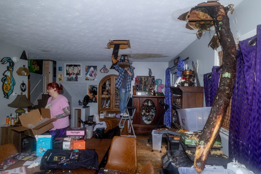 MORROW, GEORGIA – SEPTEMBER 27: Sisters Molly Coffee, left, and Victoria Coffee, right, work to clean up their home after a tree fell on their house and protruded through their living room and Victoria’s bedroom in Morrow, Georgia on Friday, September 27, 2024. “It doesn’t feel like tragedy, it feels like we are very lucky,” said Molly Coffee about the late-night incident.