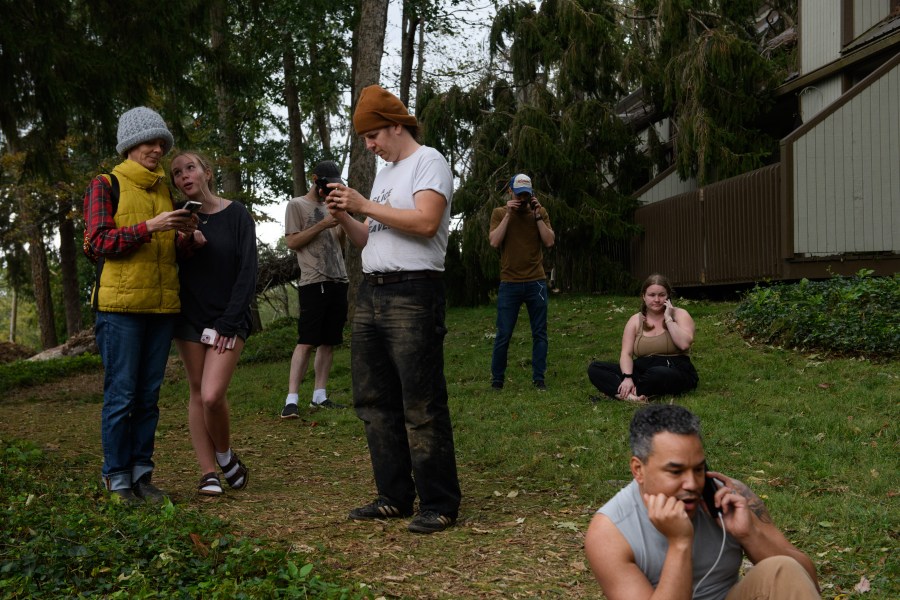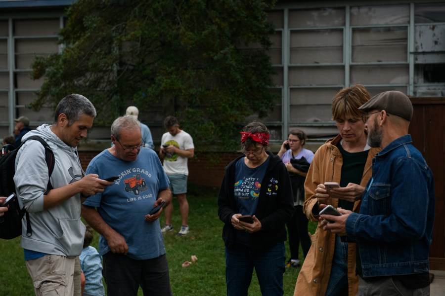ASHEVILLE, NORTH CAROLINA – SEPTEMBER 28: Residents make phone calls in their neighborhood after heavy rains from hurricane Helene caused record flooding and damage on September 28, 2024 in Asheville, North Carolina. Hurricane Helene made landfall in Florida’s Big Bend on Thursday night with winds up to 140 mph and storm surges that killed at least 42 people in several states. (Photo by Melissa Sue Gerrits/Getty Images)