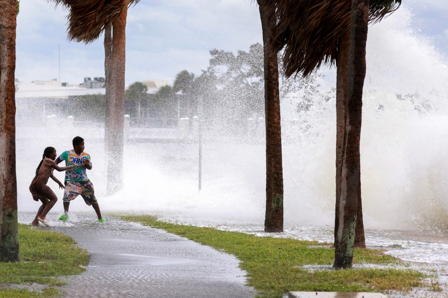 ST. PETERSBURG, FLORIDA – SEPTEMBER 26: People are splashed by churning surf from Tampa Bay as Hurricane Helene passes offshore on September 26, 2024, in St. Petersburg, Florida. Helene is forecast to become a major hurricane, bringing the potential for deadly storm surges, flooding rain, and destructive hurricane-force winds along parts of the Florida West Coast. (Photo by Joe Raedle/Getty Images)