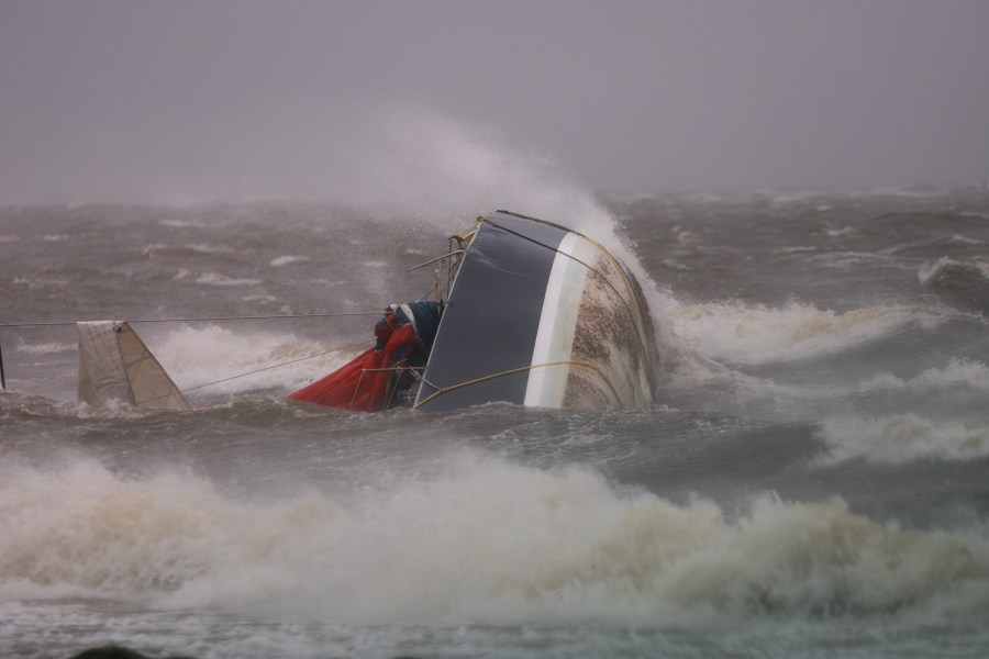 ST PETERSBURG, FLORIDA – SEPTEMBER 2: A capsized boat washes ashore as Hurricane Helene churns offshore on September 26, 2024 in St. Peteersburg Florida. Already a Category 3 storm, Helene was expected to gain further strength before making landfall this evening on Florida’s northwestern coast. Flash flood warnings extend to northern Georgia and western North Carolina. (Photo by Joe Raedle/Getty Images)