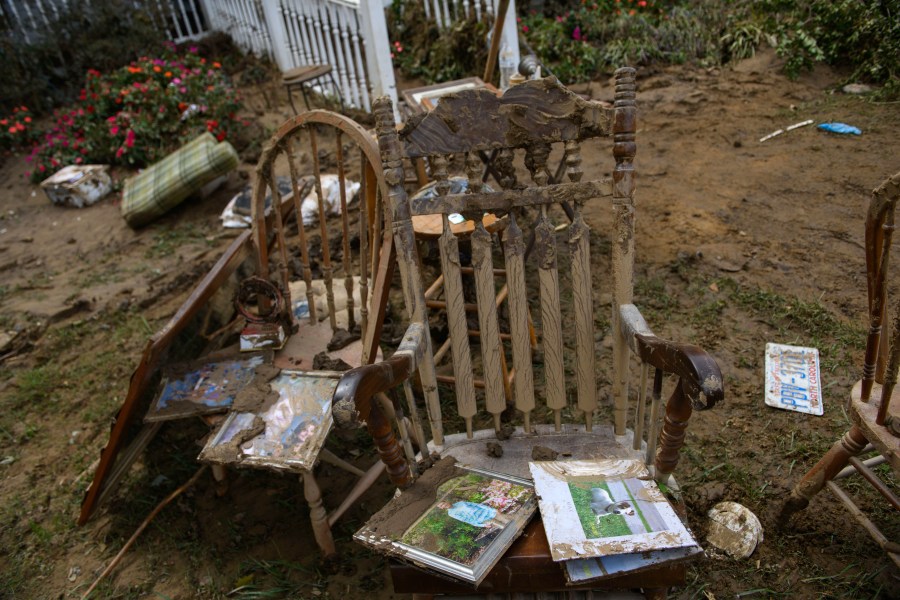 OLD FORT, NORTH CAROLINA – SEPTEMBER 29: Keepsakes belonging to Terry Wilson lay outside his mother’s home in the aftermath of Hurricane Helene on September 29, 2024 in Old Fort, North Carolina. Wilson said their beloved dog’s ashes were found after the flooding. According to reports, more than 60 people have been killed across the South due to the storm, and millions have been left without power. North Carolina has been approved for a Federal Major Disaster Declaration. (Photo by Melissa Sue Gerrits/Getty Images)