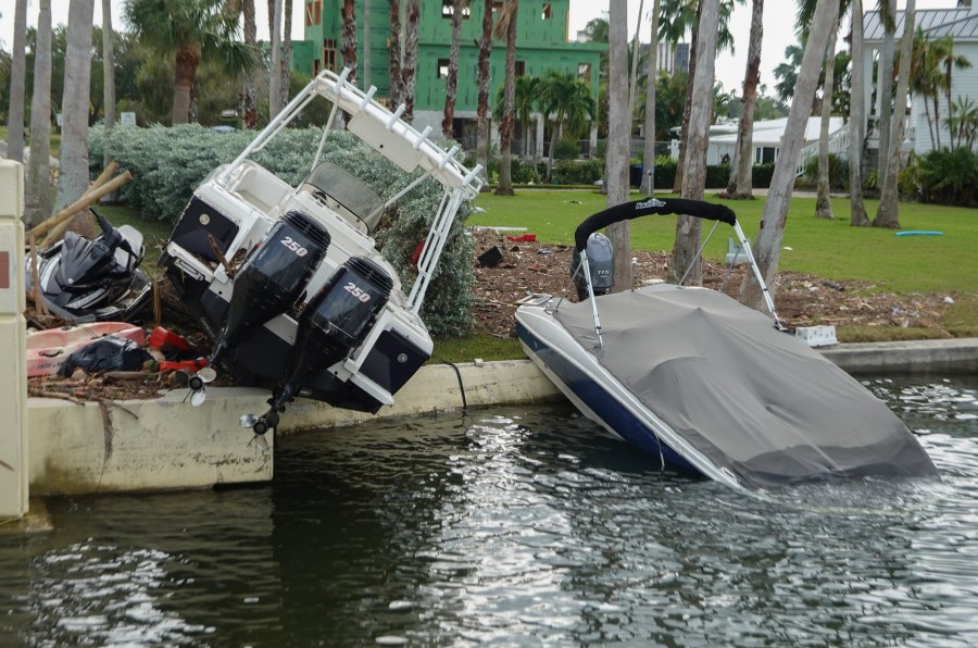 GULFPORT, FL – SEPTEMBER 26: A boat washed ashore as storm surge affects Gulfport, Fla. as Hurricane Helene passed through the Gulf of Mexico to the West on September 26, 2024. (Photo by Thomas Simonetti for The Washington Post via Getty Images)