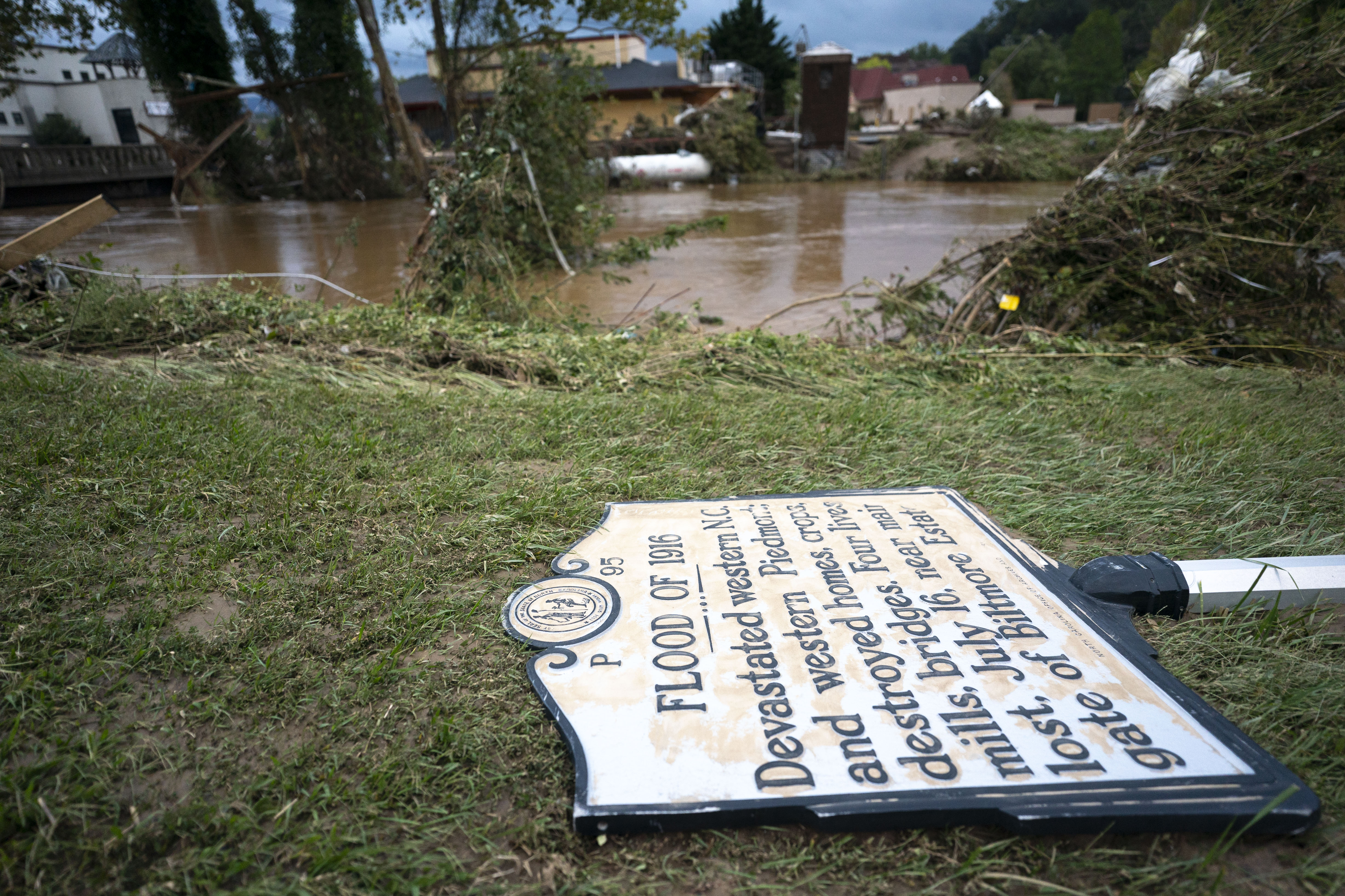 ASHEVILLE, NORTH CAROLINA – SEPTEMBER 28: A sign commentating the flood of 1916 lies on the ground next to a flooded waterway near the Biltmore Village in the aftermath of Hurricane Helene on September 28, 2024 in Asheville, North Carolina. Hurricane Helene made landfall Thursday night in Florida’s Big Bend with winds up to 140 mph. (Photo by Sean Rayford/Getty Images)