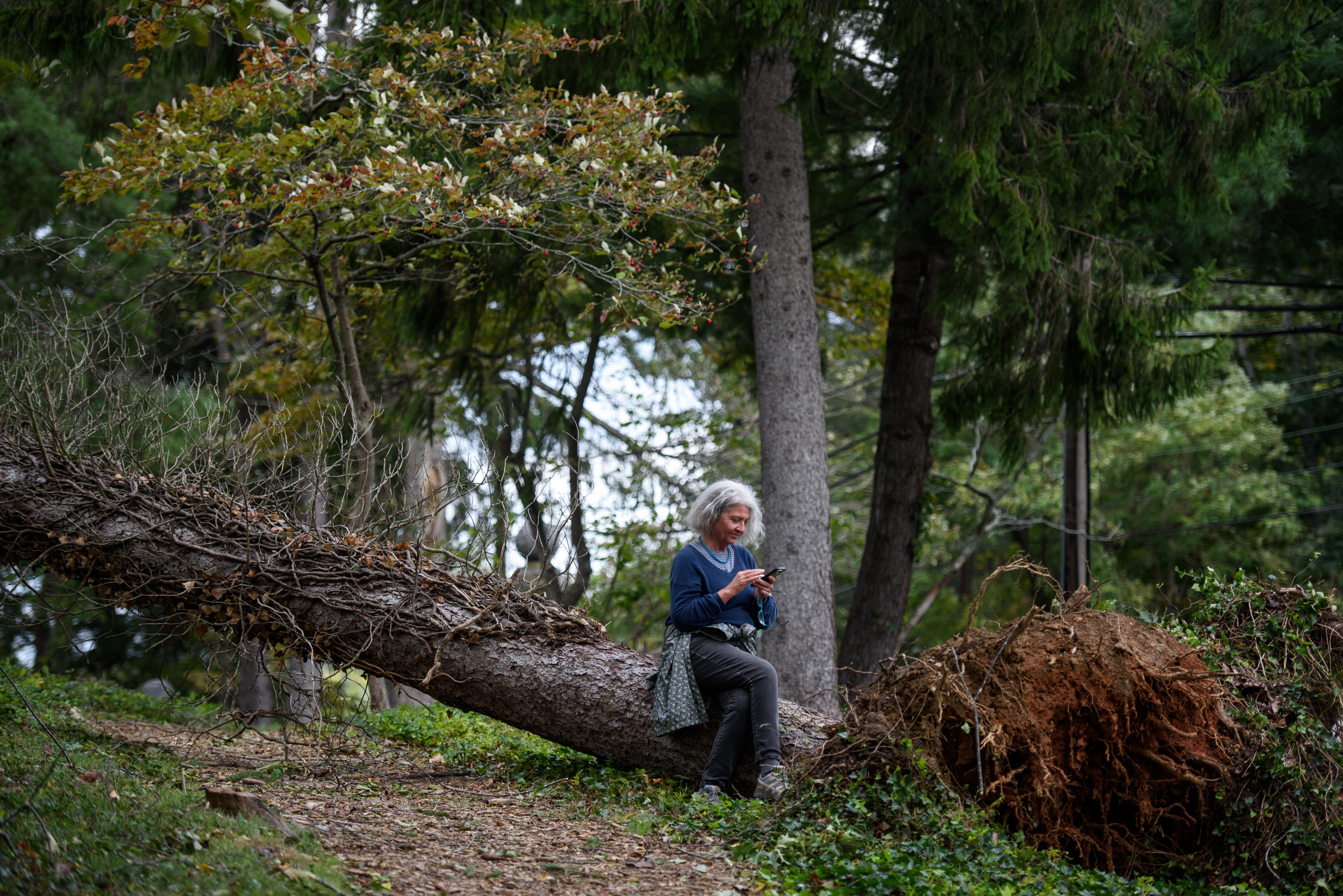 ASHEVILLE, NORTH CAROLINA – SEPTEMBER 28: A woman uses cell service in a particular spot after heavy rains from hurricane Helene caused record flooding and damage on September 28, 2024 in Asheville, North Carolina. Cell service and internet were mostly unavailable throughout the area, leaving people unable to contact employers, loved ones, and employees. (Photo by Melissa Sue Gerrits/Getty Images)
