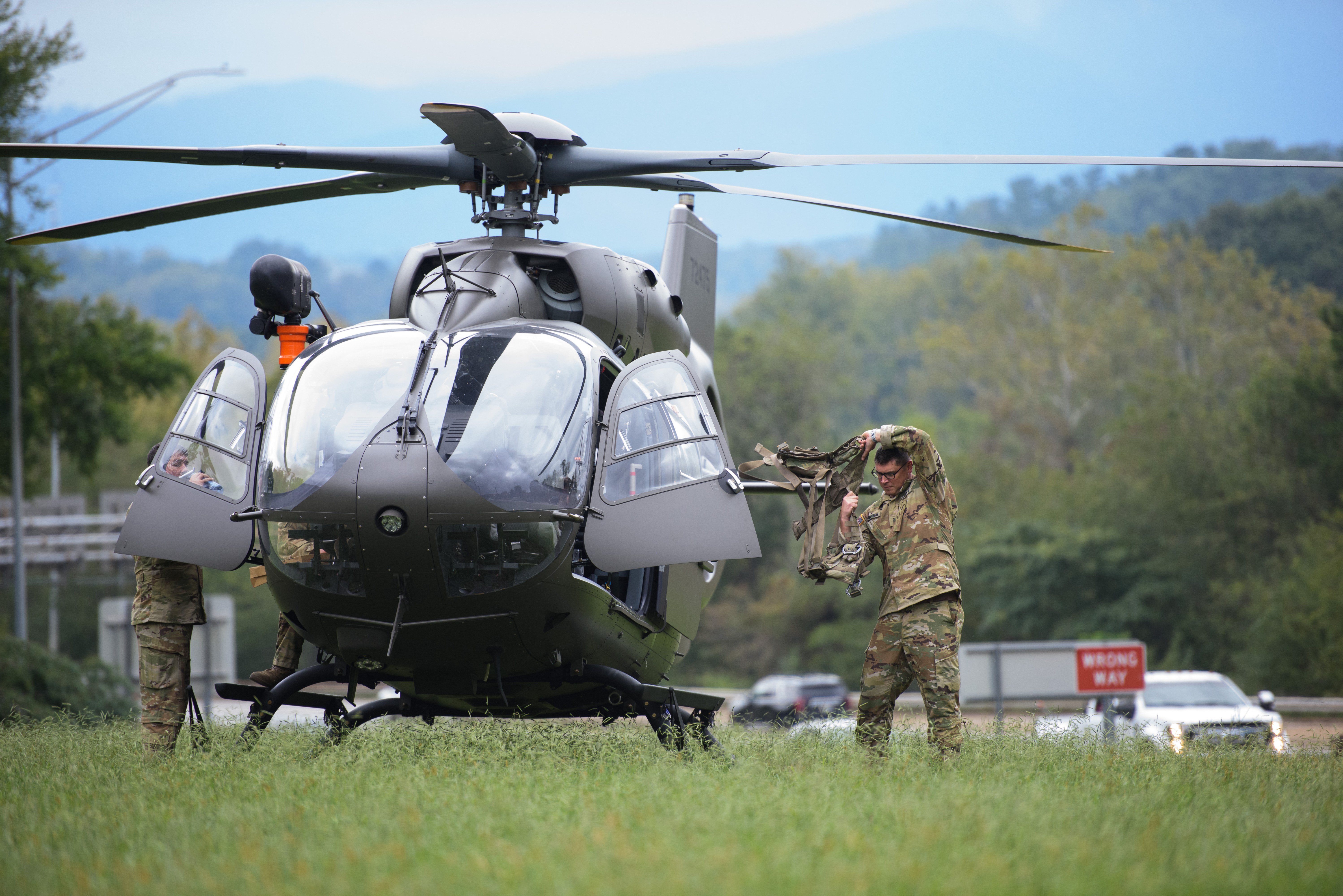 ASHEVILLE, NORTH CAROLINA – SEPTEMBER 28: Military personnel prepare to enter a helicopter on September 28, 2024 near downtown Asheville, North Carolina. At the time of writing the Sheriff’s office reported 64 individuals unaccounted for. Hurricane Helene made landfall in Florida’s Big Bend on Thursday night with winds up to 140 mph and storm surges that killed at least 42 people in several states. (Photo by Melissa Sue Gerrits/Getty Images)