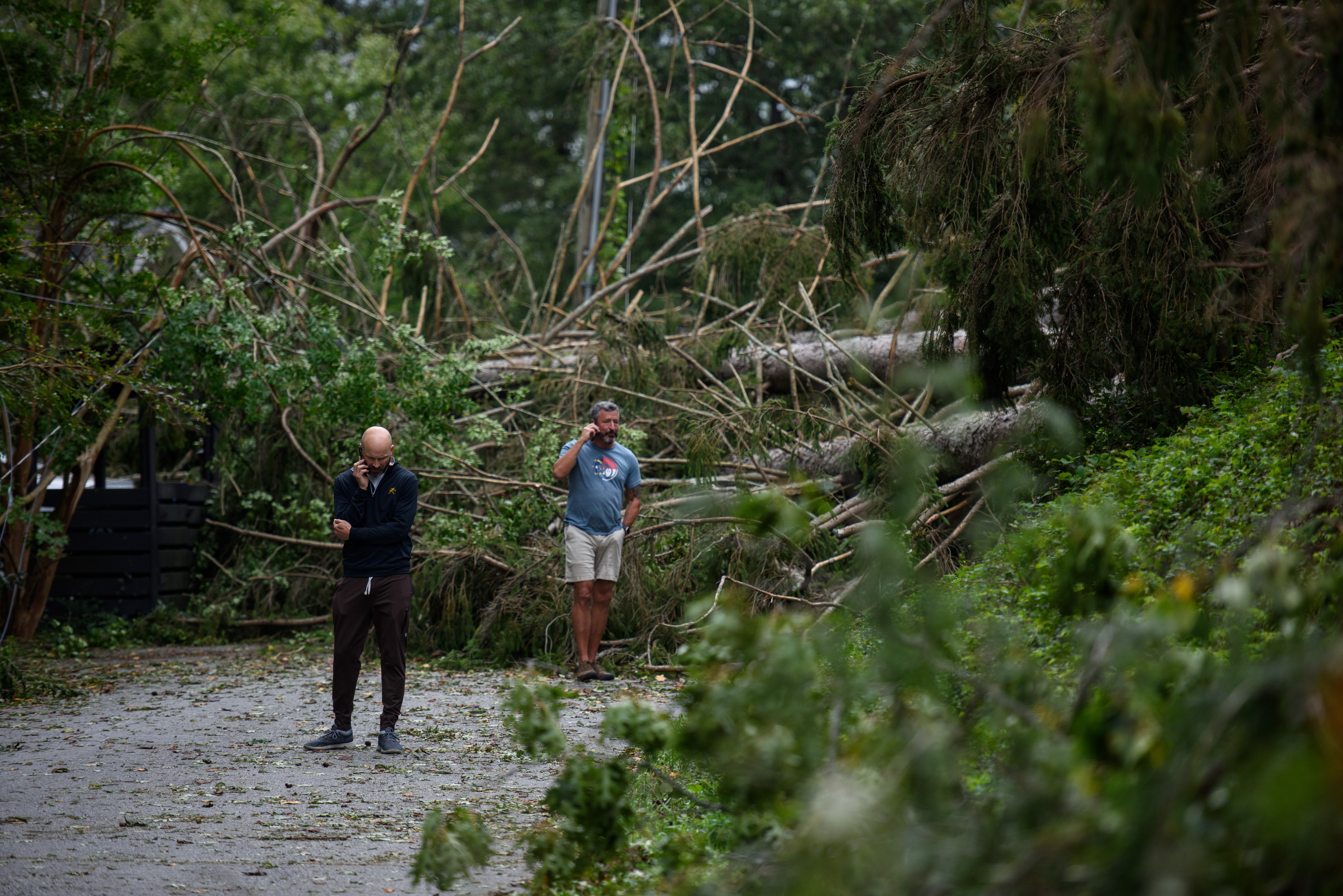 ASHEVILLE, NORTH CAROLINA – SEPTEMBER 28: James Patton, right, makes phone calls in front of him home obscured by downed trees after heavy rains from hurricane Helene caused record flooding and damage on September 28, 2024 in Asheville, North Carolina. Hurricane Helene made landfall in Florida’s Big Bend on Thursday night with winds up to 140 mph and storm surges that killed at least 42 people in several states. (Photo by Melissa Sue Gerrits/Getty Images)