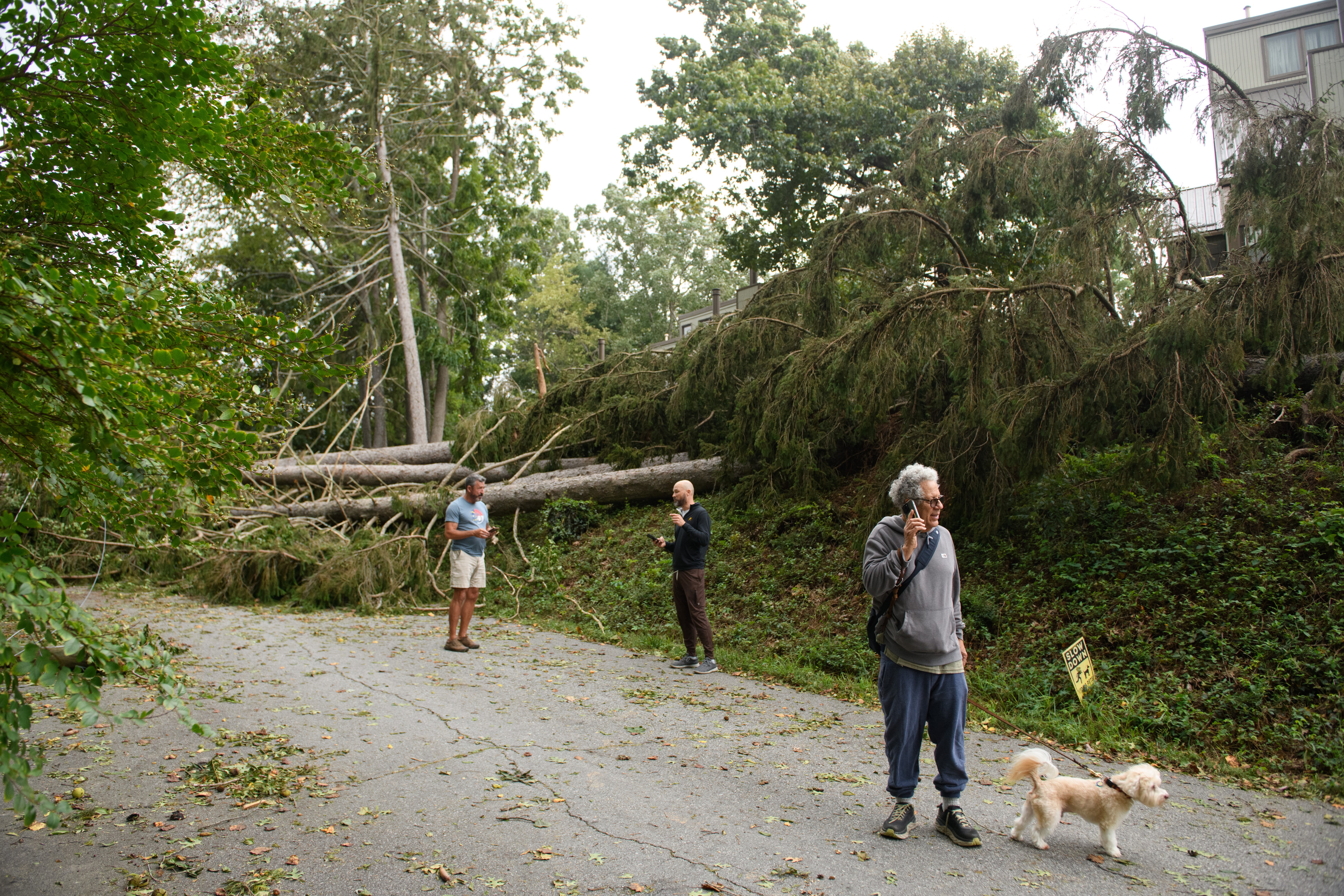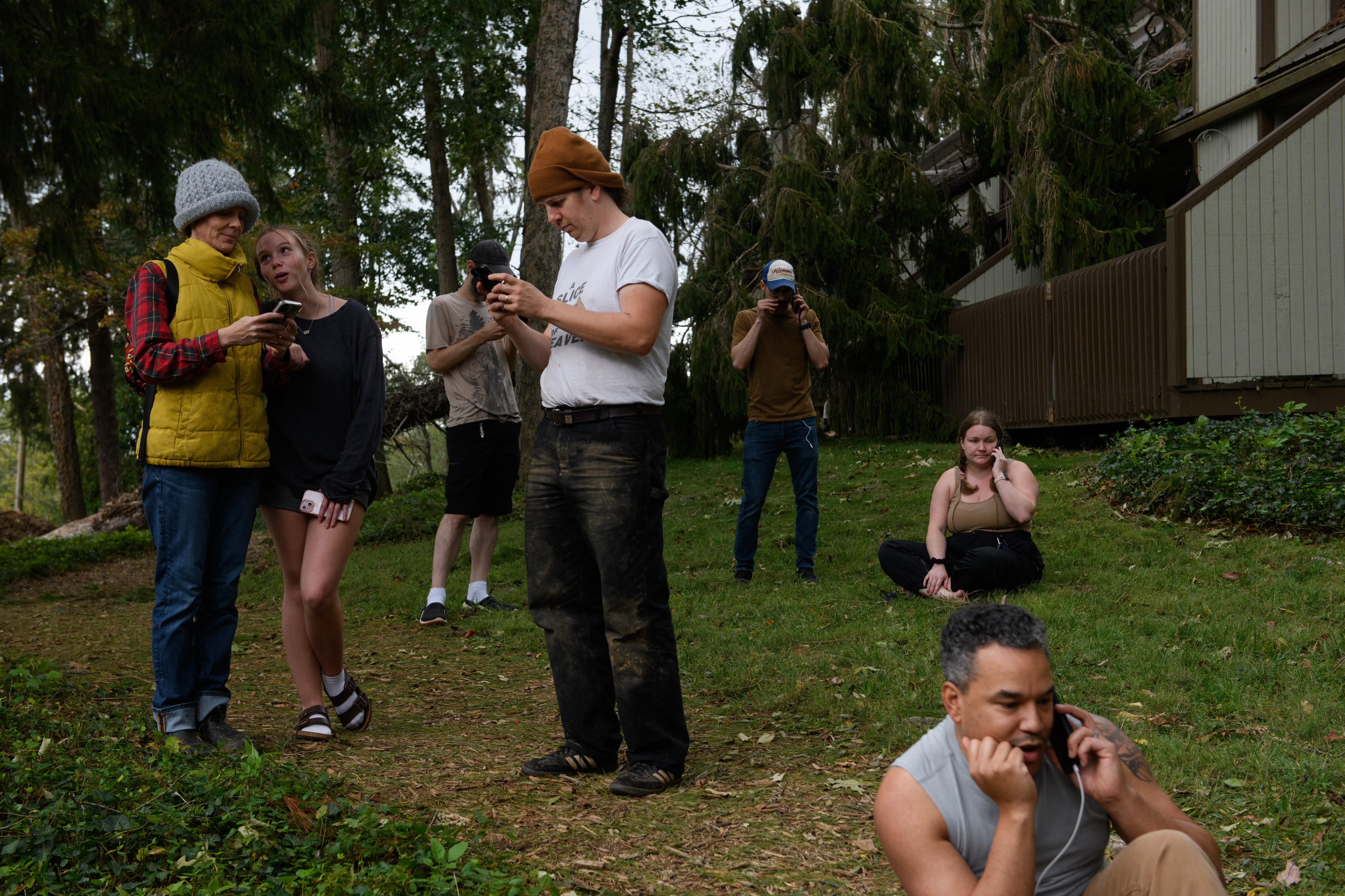 ASHEVILLE, NORTH CAROLINA – SEPTEMBER 28: Residents make phone calls in front of homes obscured by downed trees after heavy rains from hurricane Helene caused record flooding and damage on September 28, 2024 in Asheville, North Carolina. Hurricane Helene made landfall in Florida’s Big Bend on Thursday night with winds up to 140 mph and storm surges that killed at least 42 people in several states. (Photo by Melissa Sue Gerrits/Getty Images)