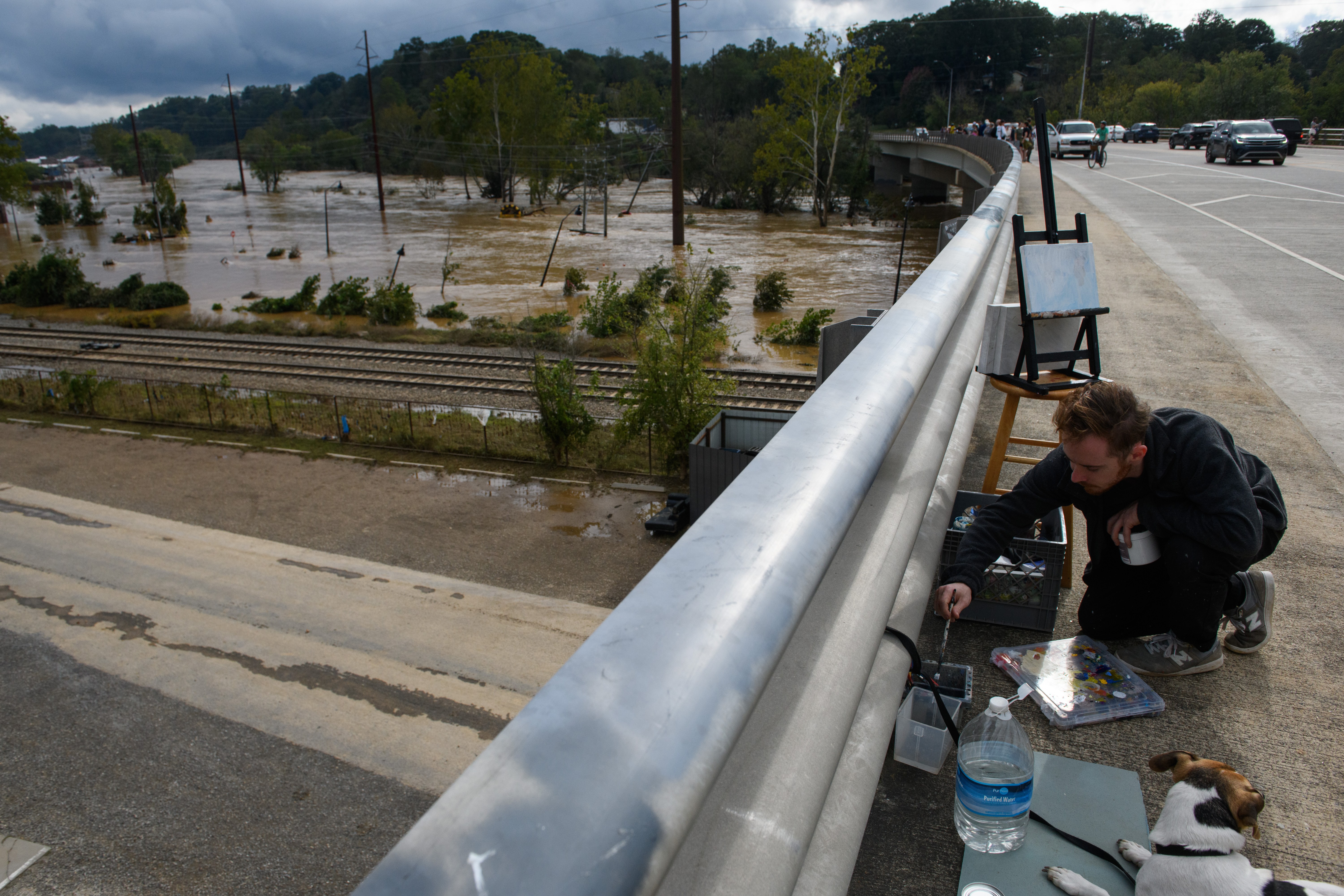 ASHEVILLE, NORTH CAROLINA – SEPTEMBER 28: Colton Dion prepares to paint a plein air documentation of the damage to the Arts District near Downtown after heavy rains from hurricane Helene caused record flooding and damage on September 28, 2024 in Asheville, North Carolina. Hurricane Helene made landfall in Florida’s Big Bend on Thursday night with winds up to 140 mph and storm surges that killed at least 42 people in several states. (Photo by Melissa Sue Gerrits/Getty Images)