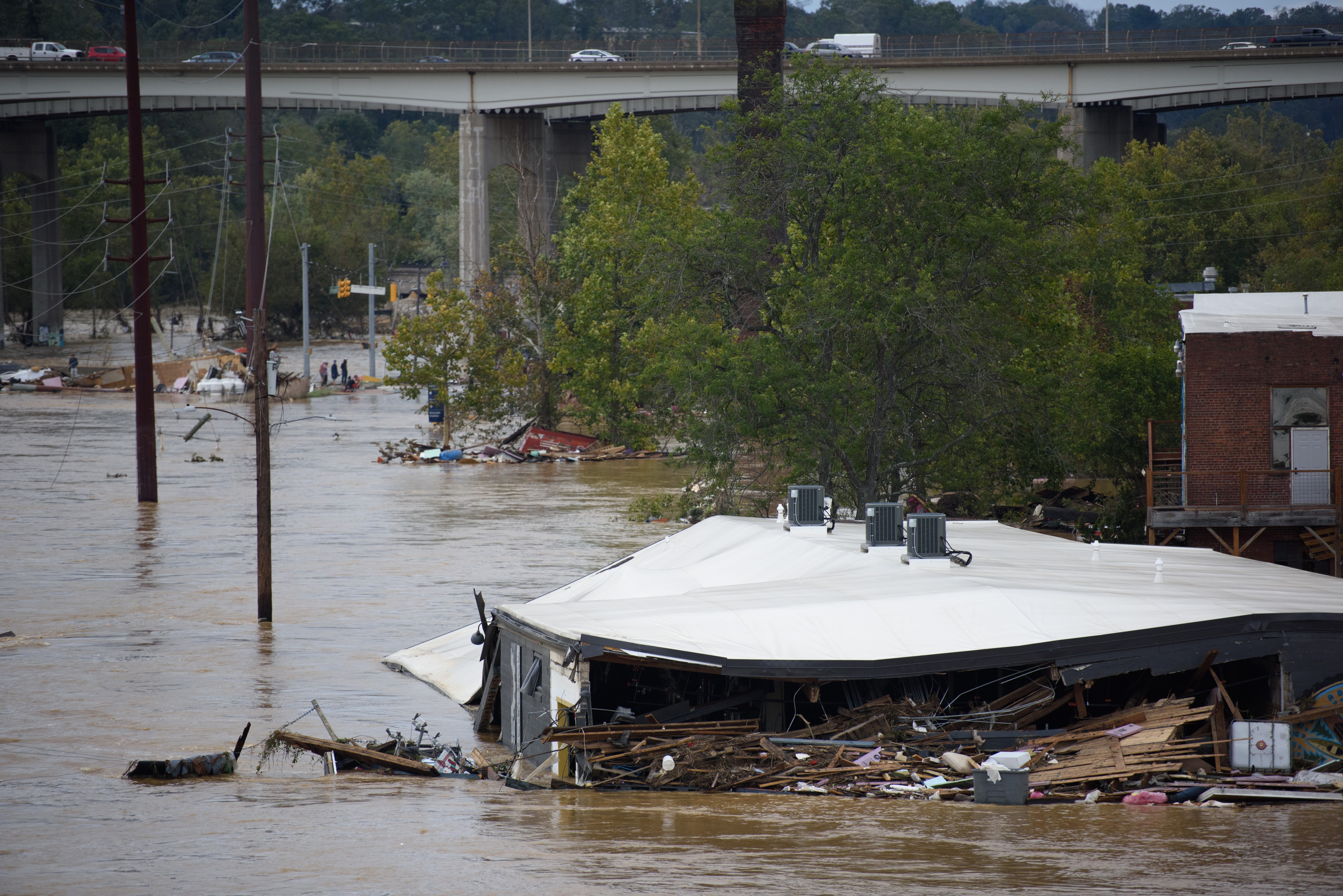 ASHEVILLE, NORTH CAROLINA – SEPTEMBER 28: Heavy rains from Hurricane Helene caused record flooding and damage on September 28, 2024 in Asheville, North Carolina. Hurricane Helene made landfall in Florida’s Big Bend on Thursday night with winds up to 140 mph and storm surges that killed at least 42 people in several states. (Photo by Melissa Sue Gerrits/Getty Images)