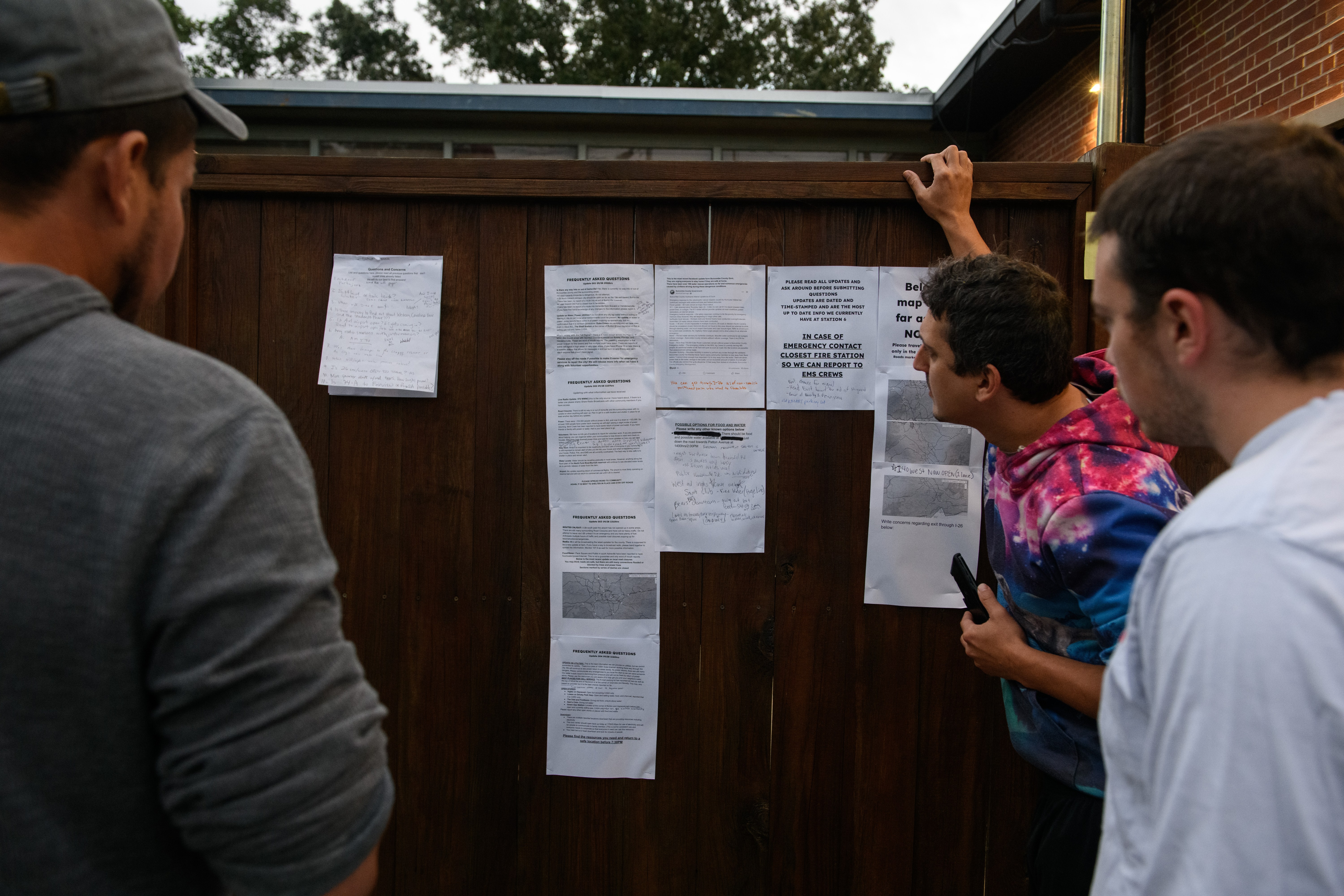 ASHEVILLE, NORTH CAROLINA – SEPTEMBER 28: Residents make phone calls in their neighborhood after heavy rains from hurricane Helene caused record flooding and damage on September 28, 2024 in Asheville, North Carolina. Hurricane Helene made landfall in Florida’s Big Bend on Thursday night with winds up to 140 mph and storm surges that killed at least 42 people in several states. (Photo by Melissa Sue Gerrits/Getty Images)