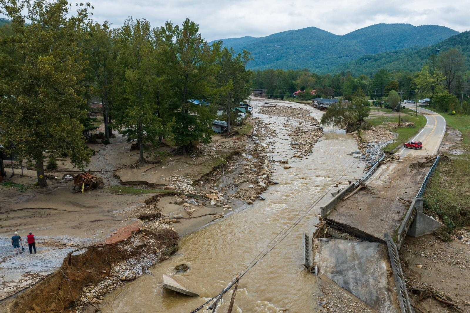 North Cove, N.C. – SEPTEMBER 28: Hurricane Helene caused flooding on the North Fork Catawba River in McDowell County that washed out a bridge on Highway 22 in North Cove, N.C. on Sept. 28, 2024, disconnecting communities and isolating them from already limited resources. (Photo by Julia Wall for The Washington Post via Getty Images)