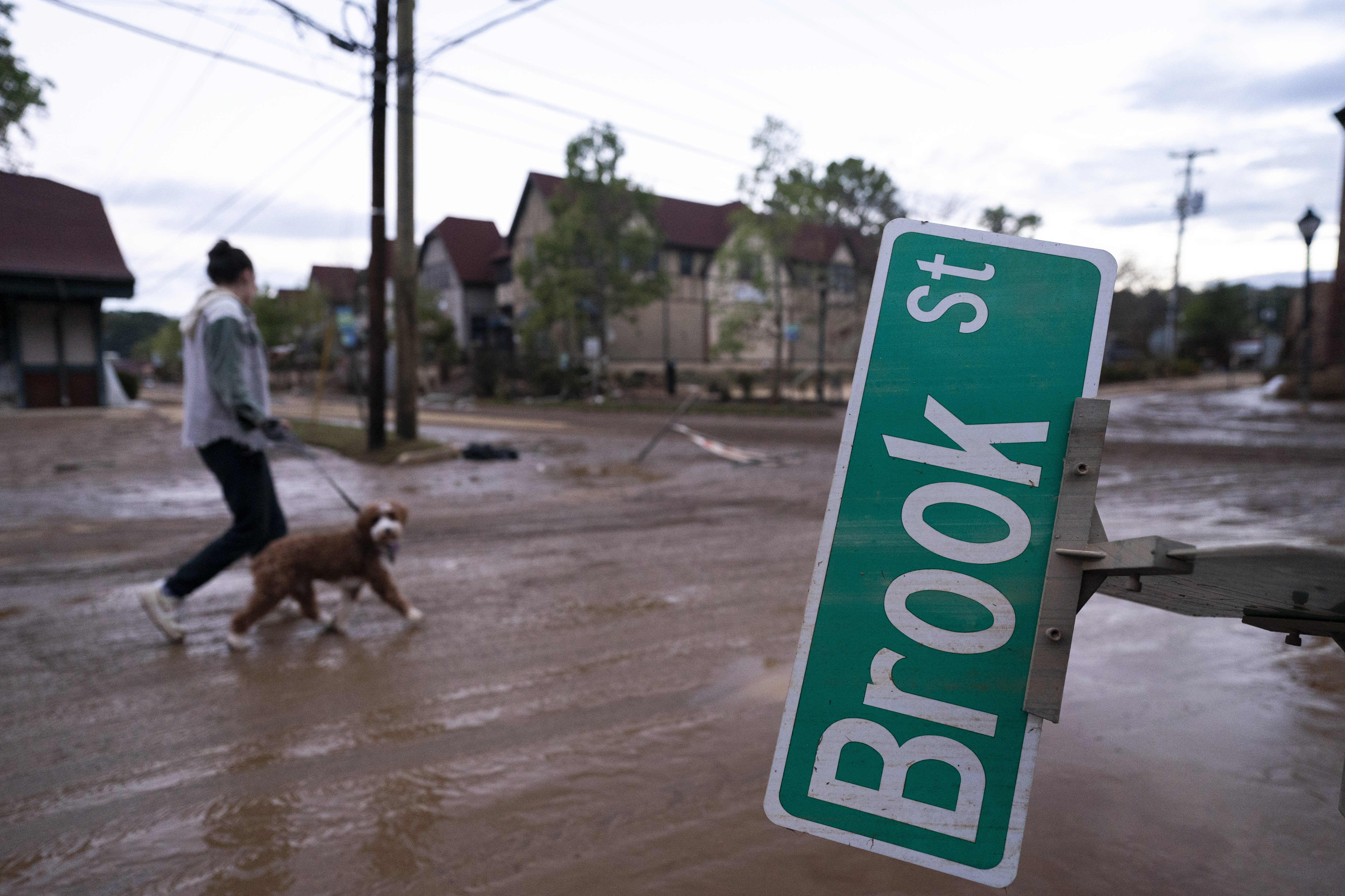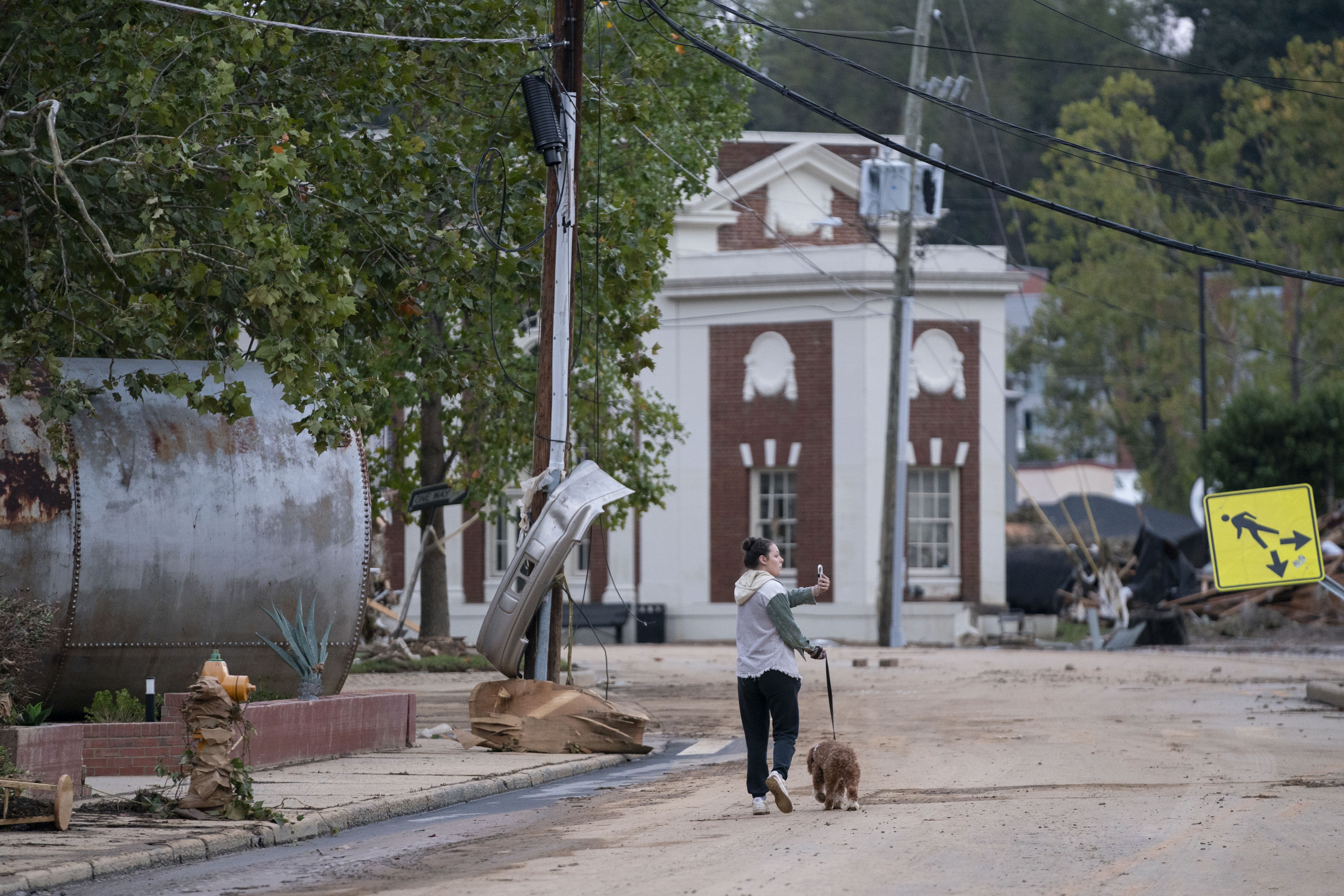 ASHEVILLE, NORTH CAROLINA – SEPTEMBER 29: Mary Grace and her dog, Marley, walk around the Biltmore Village in the aftermath of Hurricane Helene on September 29, 2024 in Asheville, North Carolina. According to reports, more than 60 people have been killed across the South due to the storm, and millions have been left without power. North Carolina has been approved for a Federal Major Disaster Declaration. (Photo by Sean Rayford/Getty Images)