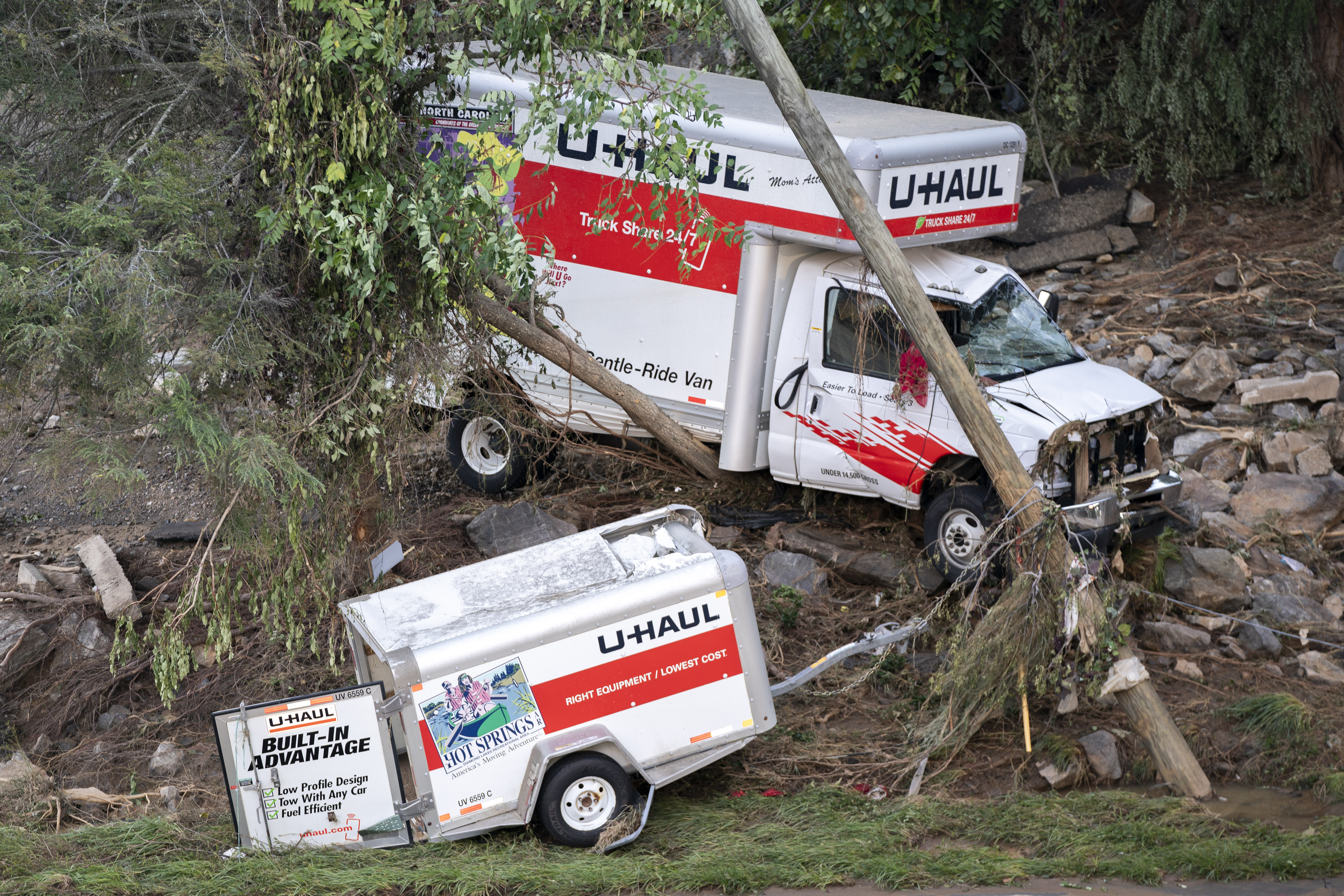ASHEVILLE, NORTH CAROLINA – SEPTEMBER 29: A storm-damaged U-Haul truck and trailer are seen in the aftermath of Hurricane Helene on September 29, 2024 in Asheville, North Carolina. According to reports, more than 60 people have been killed across the South due to the storm, and millions have been left without power. North Carolina has been approved for a Federal Major Disaster Declaration. (Photo by Sean Rayford/Getty Images)