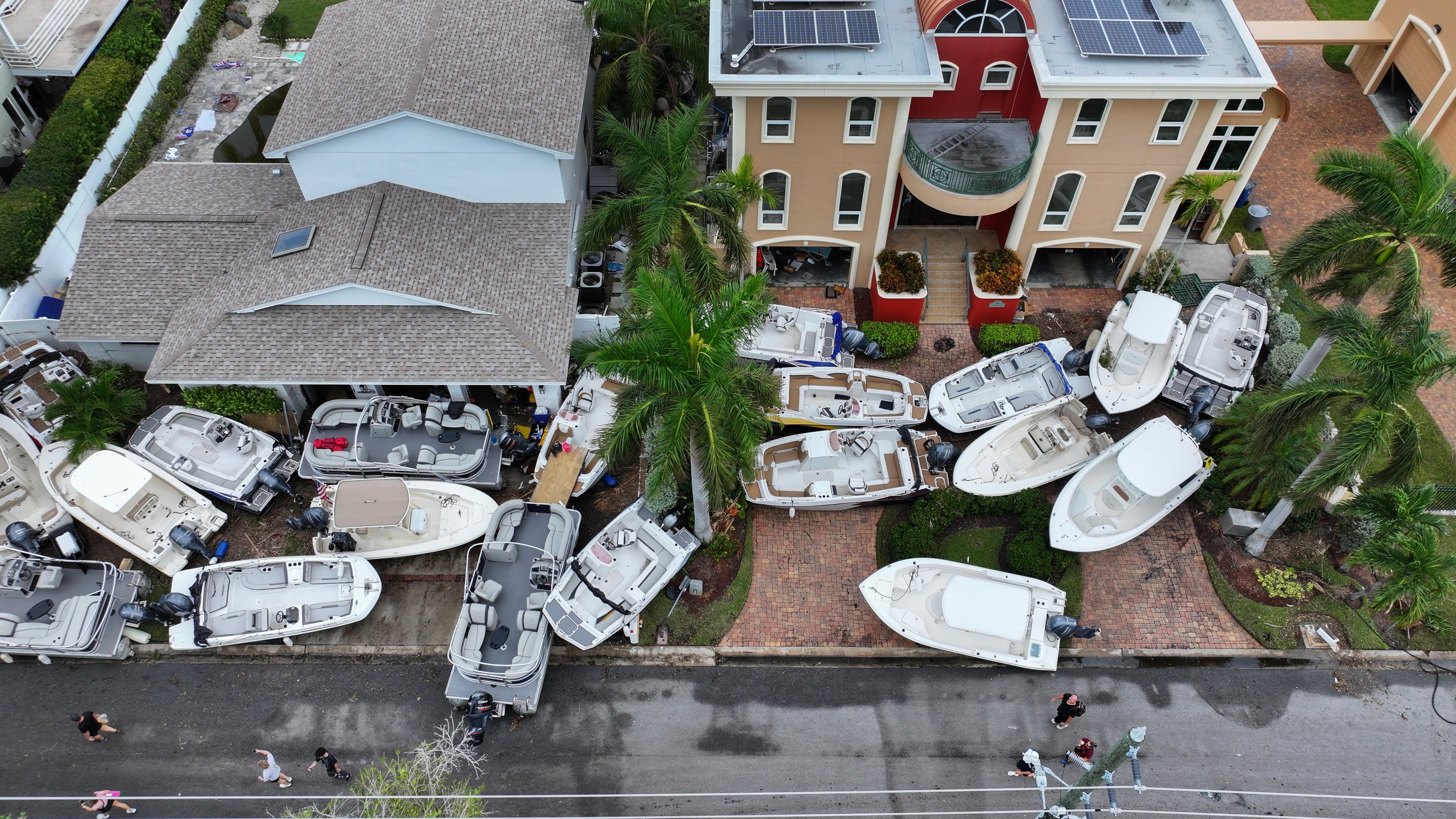 TREASURE ISLAND, FLORIDA – SEPTEMBER 28: In this aerial view, boats are piled up in front of homes after Hurricane Helene hit the area as it passed offshore on September 28, 2024 in Treasure Island, Florida. Hurricane Helene made landfall Thursday night in Florida’s Big Bend with winds up to 140 mph and storm surges that killed at least 42 people in several states. (Photo by Joe Raedle/Getty Images)