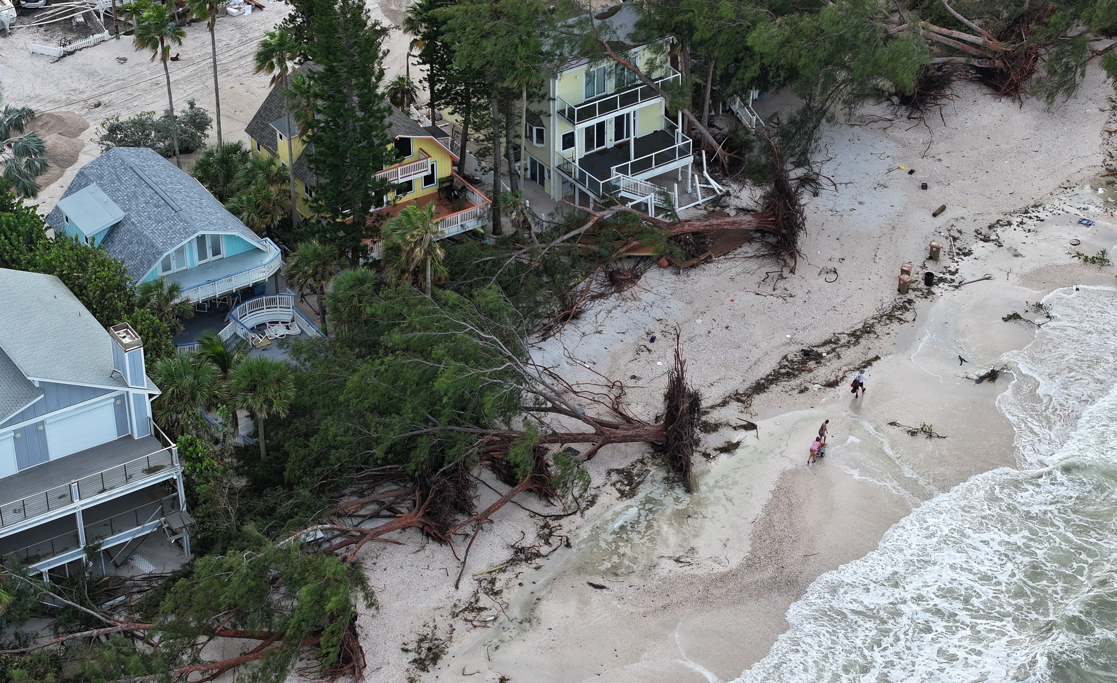 TREASURE ISLAND, FLORIDA – SEPTEMBER 28: In this aerial view, fallen trees and debris line the beach after Hurricane Helene hit the area with high surge waters as it passed offshore on September 28, 2024 in Treasure Island, Florida. Hurricane Helene made landfall Thursday night in Florida’s Big Bend with winds up to 140 mph and storm surges that killed at least 42 people in several states. (Photo by Joe Raedle/Getty Images)