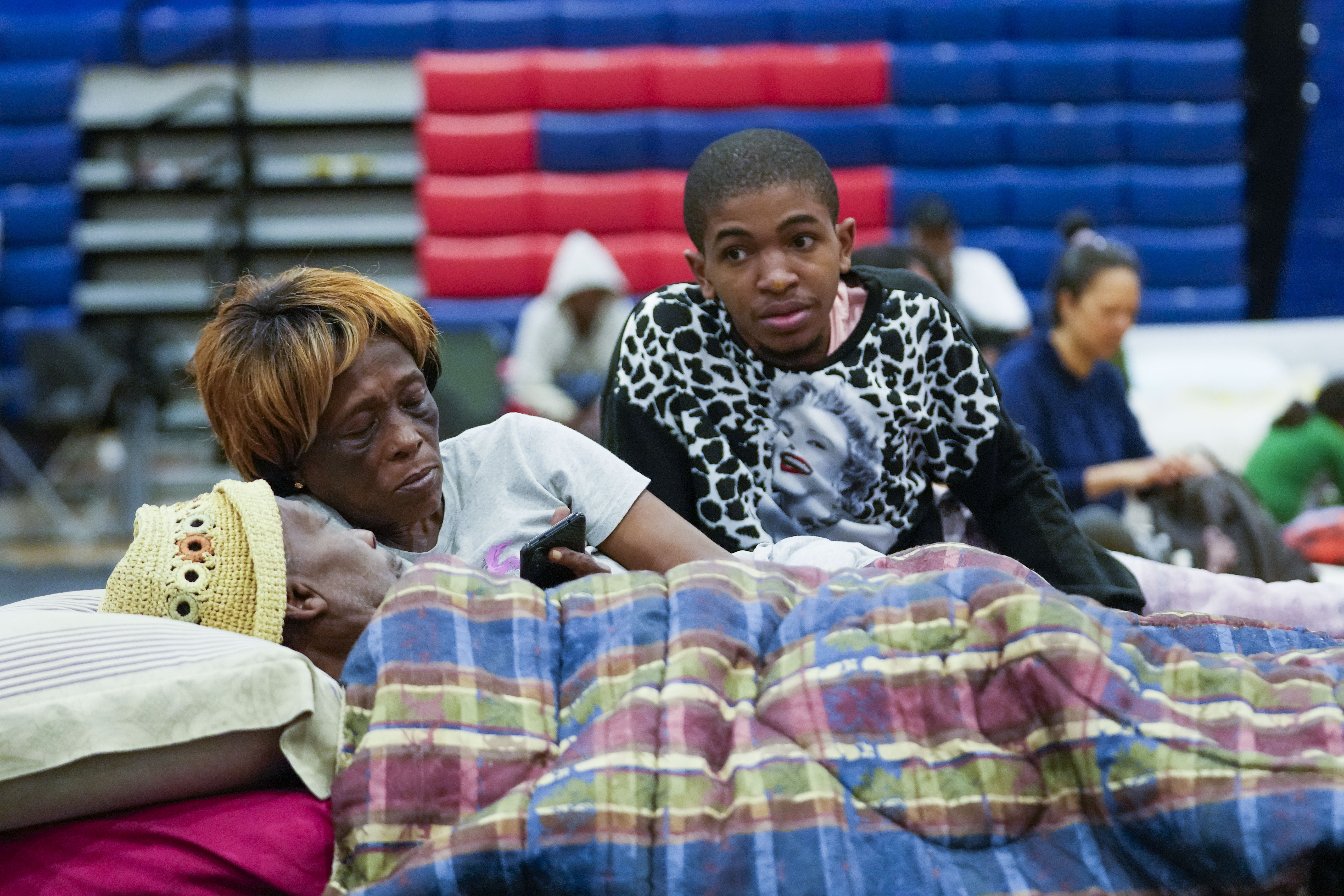 Bobby Joe Edwards, Sr., and his wife Lillie Edwards, of Walkalla, Fla., and their grandson Tavarrious Dixon, right, rest inside a hurricane evacuation shelter at Fairview Middle School, ahead of Hurricane Helene, expected to make landfall here today, in Leon County, Fla., Thursday, Sept. 26, 2024. (AP Photo/Gerald Herbert)
