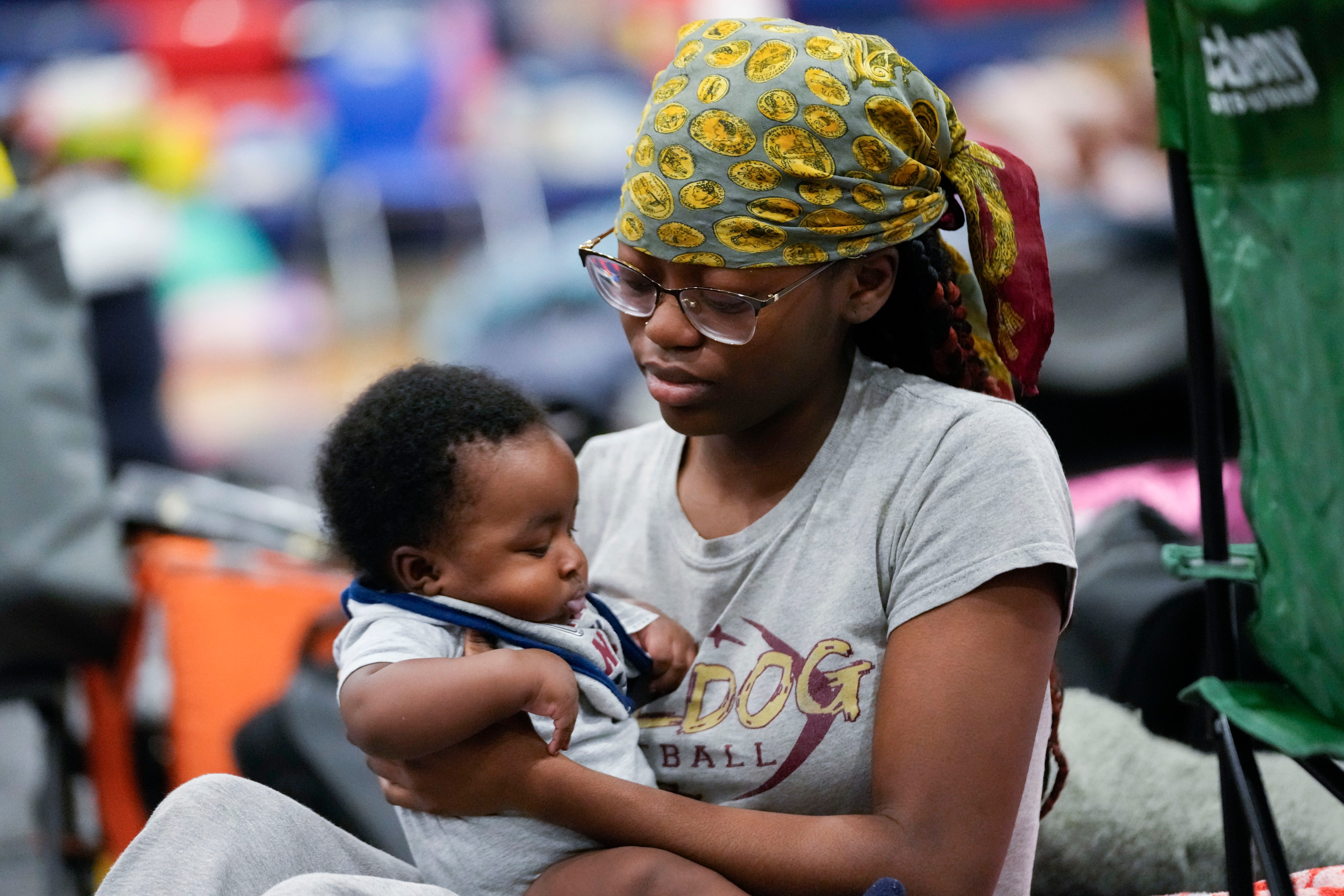 Katoria Harvey, of Tallahassee, sits with her niece Ny’Year Harvey, 3 months, inside a hurricane evacuation shelter at Fairview Middle School, ahead of Hurricane Helene, expected to make landfall here today, in Leon County, Fla., Thursday, Sept. 26, 2024. (AP Photo/Gerald Herbert)