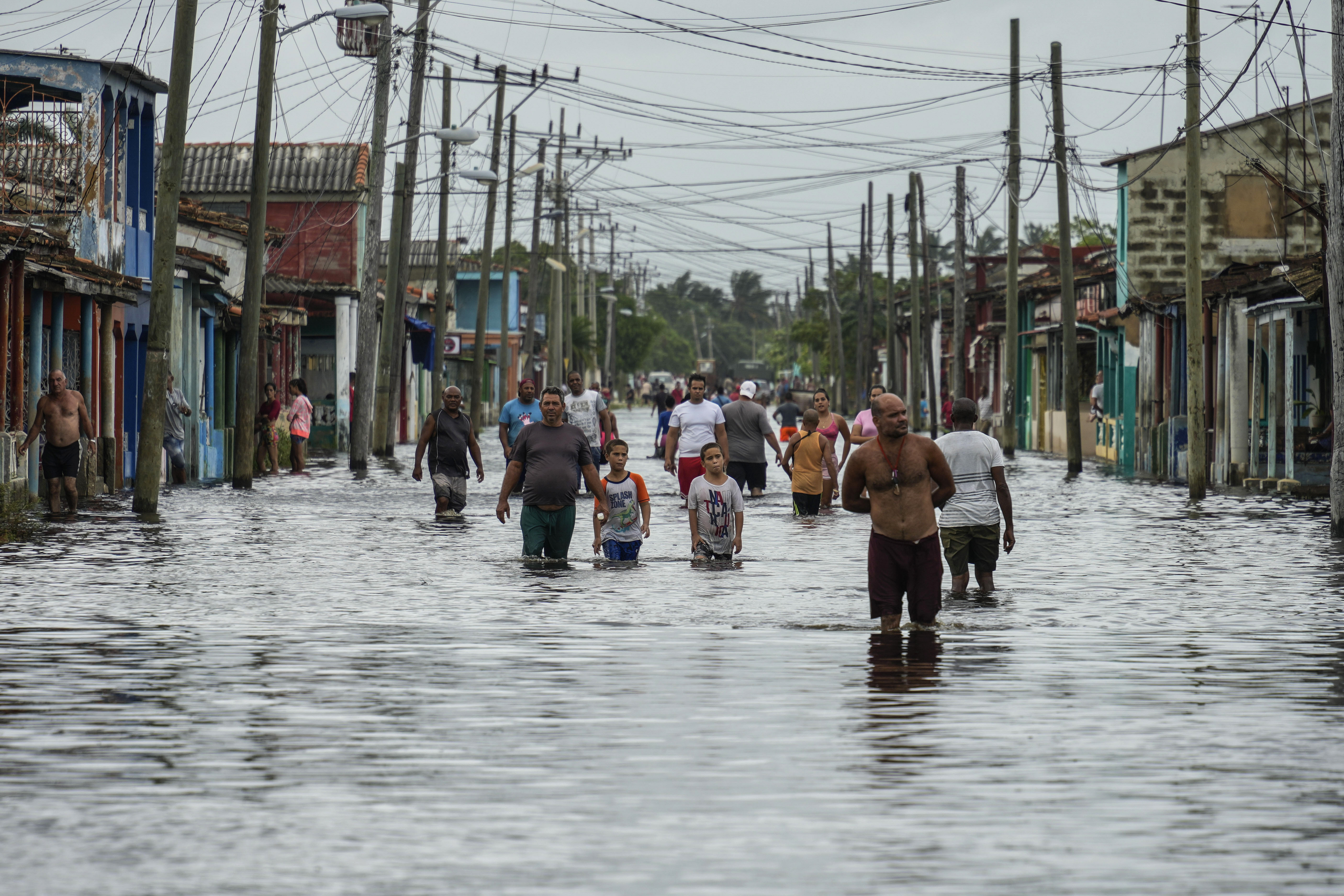 Residents wade through a street flooded in the passing of Hurricane Helene, in Batabano, Mayabeque province, Cuba, Thursday, Sept. 26, 2024. (AP Photo/Ramon Espinosa)