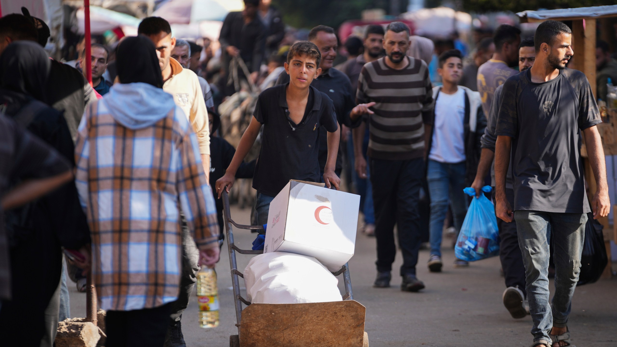 A Palestinian youth carries humanitarian aid in Deir al-Balah, Gaza, Wednesday, Nov. 13, 2024. (AP Photo/Abdel Kareem Hana)