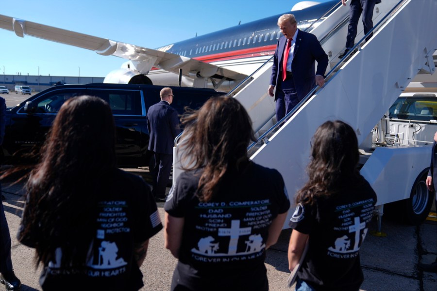 Republican presidential nominee former President Donald Trump arrives as family members of Corey Comperatore wait as he arrives at Pittsburgh International Airport en route to speak at a campaign rally at the Butler Farm Show on Saturday, Oct. 5, 2024, in Pittsburgh. (AP Photo/Evan Vucci)