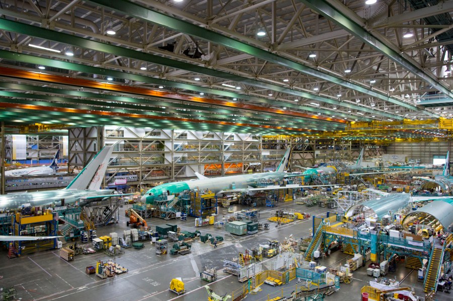 Employees assemble Boeing 777 airplanes on a moving production line at the company’s facility in Everett, Washington. Photographer: Mike Kane/Bloomberg via Getty Images